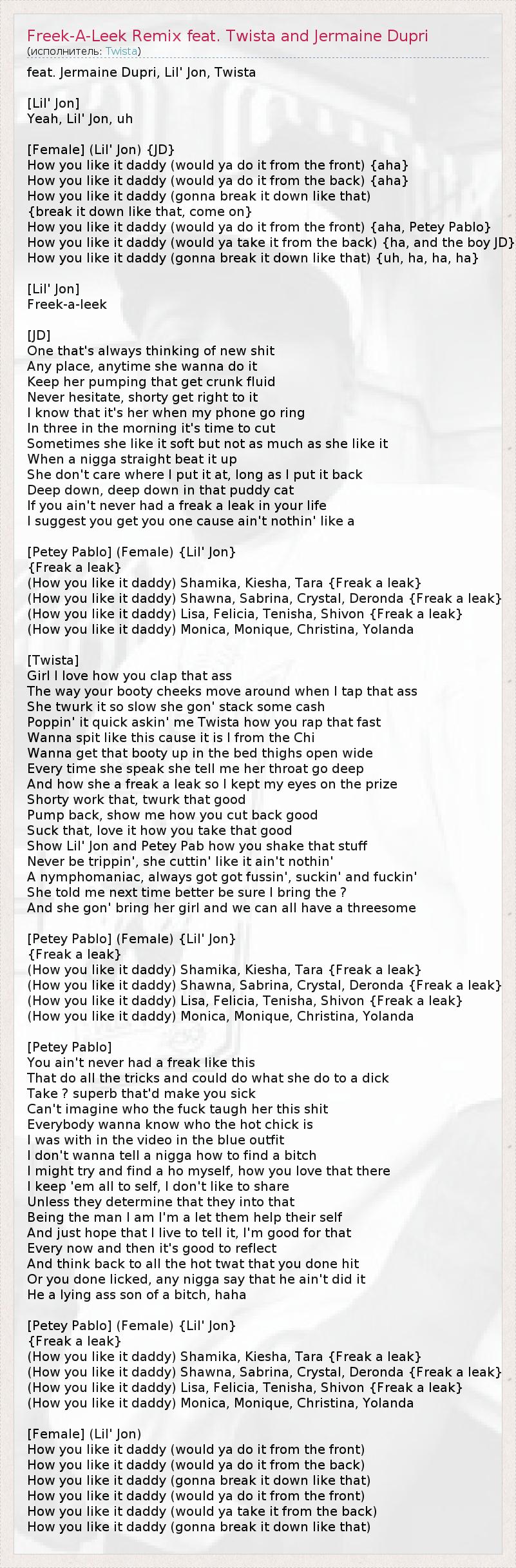 А как ты думаешь, о чем песня "Freek-A-Leek Remix feat. Twista and Jermaine Dupri" ?