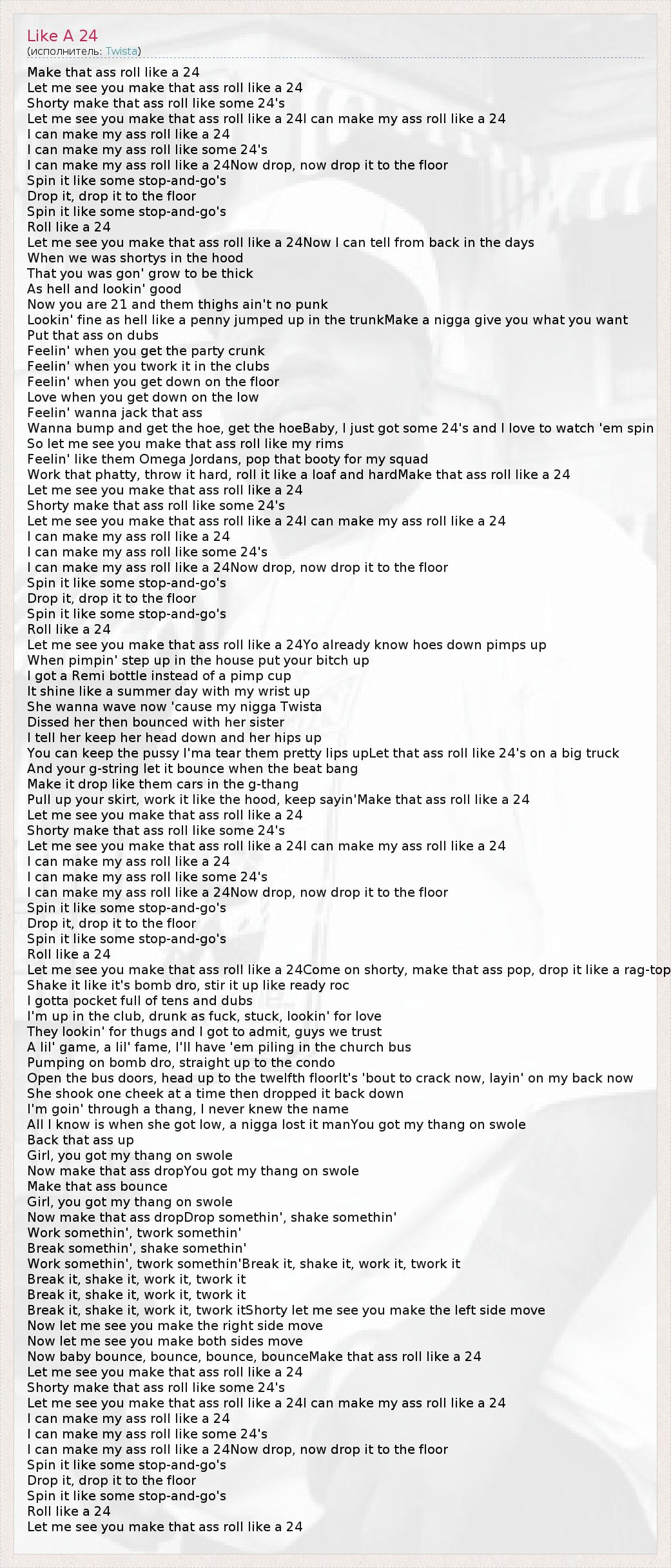 Pull up your skirt, work it like the hood, keep sayin'Make that ass roll like a 24
