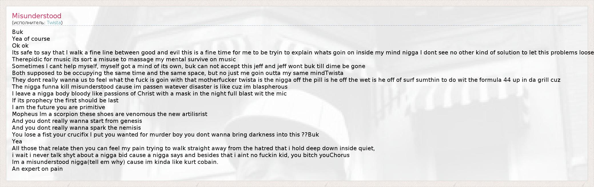 Buk Yea of course Ok ok Its safe to say that I walk a fine line between good and evil this is a fine time for me to be tryin to explain whats goin on inside my mind nigga I dont see no other kind of solution to let this problems loose Therepidic for music its sort a misuse to massage my mental survive on music Sometimes I cant help myself, myself got a mind of its own, buk can not accept this jeff and jeff wont buk till dime be gone Both supposed to be occupying the same time and the same space, but no just me goin outta my same mindTwista They dont really wanna us to feel what the fuck is goin with that motherfucker twista is the nigga off the pill is he off the wet is he off of surf sumthin to do wit the formula 44 up in da grill cuz The nigga funna kill misunderstood cause im passen watever disaster is like cuz im blaspherous I leave a nigga body bloody like passions of Christ with a mask in the night full blast wit the mic If its prophecy the first should be last I am the future you are primitive Mopheus Im a scorpion these shoes are venomous the new artilisrist And you dont really wanna start from genesis And you dont really wanna spark the nemisis You lose a fist your crucifix I put you wanted for murder boy you dont wanna bring darkness into this ??Buk Yea All those that relate then you can feel my pain trying to walk straight away from the hatred that i hold deep down inside quiet, i wait i never talk shyt about a nigga bid cause a nigga says and besides that i aint no fuckin kid, you bitch youChorus Im a misunderstood nigga(tell em why) cause im kinda like kurt cobain. An expert on pain