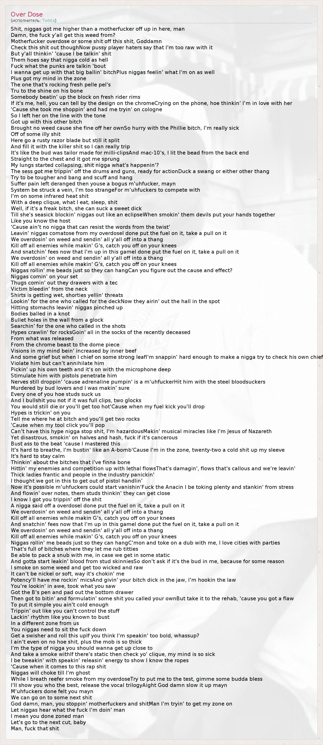 Shit, niggas got me higher than a motherfucker off up in here, man Damn, the fuck y'all get this weed from? Motherfucker overdose or some shit off this shit, Goddamn Check this shit out thoughNow pussy player haters say that I'm too raw with it But y'all thinkin' 'cause I be talkin' shit Them hoes say that nigga cold as hell Fuck what the punks are talkin 'bout I wanna get up with that big ballin' bitchPlus niggas feelin' what I'm on as well Plus got my mind in the zone The one that's rocking fresh pelle pel's Tru to the shine on his bone Somebody beatin' up the block on fresh rider rims If it's me, hell, you can tell by the design on the chromeCrying on the phone, hoe thinkin' I'm in love with her 'Cause she took me shoppin' and had me tryin' on cologne So I left her on the line with the tone Got up with this other bitch Brought no weed cause she fine off her ownSo hurry with the Phillie bitch, I'm really sick Off of some illy shit Here go a rusty razor blade but still it split And fill it with the killer shit so I can really trip It's like the bud was tailor made for milli-clipsAnd mac-10's, I lit the bead from the back end Straight to the chest and it got me sprung My lungs started collapsing, shit nigga what's happenin'? The sess got me trippin' off the drums and guns, ready for actionDuck a swang or either other thang Try to be tougher and bang and scuff and hang Suffer pain left deranged then youse a bogus m'uhfucker, mayn System be struck a vein, I'm too strangeFor m'uhfuckers to compete with I'm on some infrared heat shit With a deep clique, what I eat, sleep, shit Well, if it's a freak bitch, she can suck a sweet dick Till she's seasick blockin' niggas out like an eclipseWhen smokin' them devils put your hands together Like you know the host 'Cause ain't no nigga that can resist the words from the twist' Leavin' niggas comatose from my overdoseI done put the fuel on it, take a pull on it We overdosin' on weed and sendin' all y'all off into a thang Kill off all enemies while makin' G's, catch you off on your knees And snatchin' fees now that I'm up in this gameI done put the fuel on it, take a pull on it We overdosin' on weed and sendin' all y'all off into a thang Kill off all enemies while makin' G's, catch you off on your knees Niggas rollin' me beads just so they can hangCan you figure out the cause and effect? Niggas comin' on your set Thugs comin' out they drawers with a tec Victim bleedin' from the neck Shirts is getting wet, shorties yellin' threats Lookin' for the one who called for the deckNow they airin' out the hall in the spot Hitting stomachs leavin' niggas pinched up Bodies balled in a knot Bullet holes in the wall from a glock Searchin' for the one who called in the shots Hypes crawlin' for rocksGoin' all in the socks of the recently deceased From what was released From the chrome beast to the dome piece Visions in my mind bein' increased by inner beef And some grief but when I chief on some strong leafI'm snappin' hard enough to make a nigga try to check his own chief Violate him but can't annihilate him Pickin' up his own teeth and it's on with the microphone deep Stimulate him with pistols penetrate him Nerves still droppin' 'cause adrenaline pumpin' is a m'uhfuckerHit him with the steel bloodsuckers Murdered by bud lovers and I was makin' sure Every one of you hoe studs suck us And I bullshit you not if it was full clips, two glocks You would still die or you'll get too hot'Cause when my fuel kick you'll drop Hypes is trickin' on you Tell me where he at bitch and you'll get two rocks 'Cause when my tool click you'll pop Can't have this hype nigga stop shit, I'm hazardousMakin' musical miracles like I'm Jesus of Nazareth Yet disastrous, smokin' on halves and hash, fuck if it's cancerous Bust ass to the beat 'cause I mastered this It's hard to breathe, I'm bustin' like an A-bomb'Cause I'm in the zone, twenty-two a cold shit up my sleeve It's hard to stay calm Thinkin' about the bitches that i've finna bone Hittin' my enemies and competition up with lethal flowsThat's damagin', flows that's callous and we're leavin' Thick ladies frantic and people in the industry panickin' I thought we got in this to get out of pistol handlin' Now it's possible m'uhfuckers could start vanishin'Fuck the Anacin I be toking plenty and stankin' from stress And flowin' over notes, them studs thinkin' they can get close I know I got you trippin' off the shit A nigga said off a overdoseI done put the fuel on it, take a pull on it We overdosin' on weed and sendin' all y'all off into a thang Kill off all enemies while makin G's, catch you off on your knees And snatchin' fees now that I'm up in this gameI done put the fuel on it, take a pull on it We overdosin' on weed and sendin' all y'all off into a thang Kill off all enemies while makin' G's, catch you off on your knees Niggas rollin' me beads just so they can hangC'mon and toke on a dub with me, I love cities with parties That's full of bitches where they let me rub titties Be able to pack a snub with me, in case we get in some static And gotta start leakin' blood from stud skinniesSo don't ask if it's the bud in me, because for some reason I smoke on some weed and get too wicked and raw It can't be nickel or soft, way it's chokin' me Potency'll have me rockin' micsAnd givin' your bitch dick in the jaw, I'm hookin the law You're lookin' in awe, took what you saw Got the B's pen and pad out the bottom drawer Then got to bitin' and formulatin' some shit you called your ownBut take it to the rehab, 'cause you got a flaw To put it simple you ain't cold enough Trippin' out like you can't control the stuff Lackin' rhythm like you known to bust In a different zone from us You niggas need to sit the fuck down Get a swisher and roll this upIf you think I'm speakin' too bold, whassup? I ain't even on no hoe shit, plus the mob is so thick I'm the type of nigga you should wanna get up close to And take a smoke withIf there's static then check yo' c