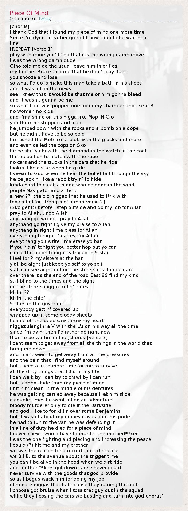 А как ты думаешь, о чем песня "Piece Of Mind" ?