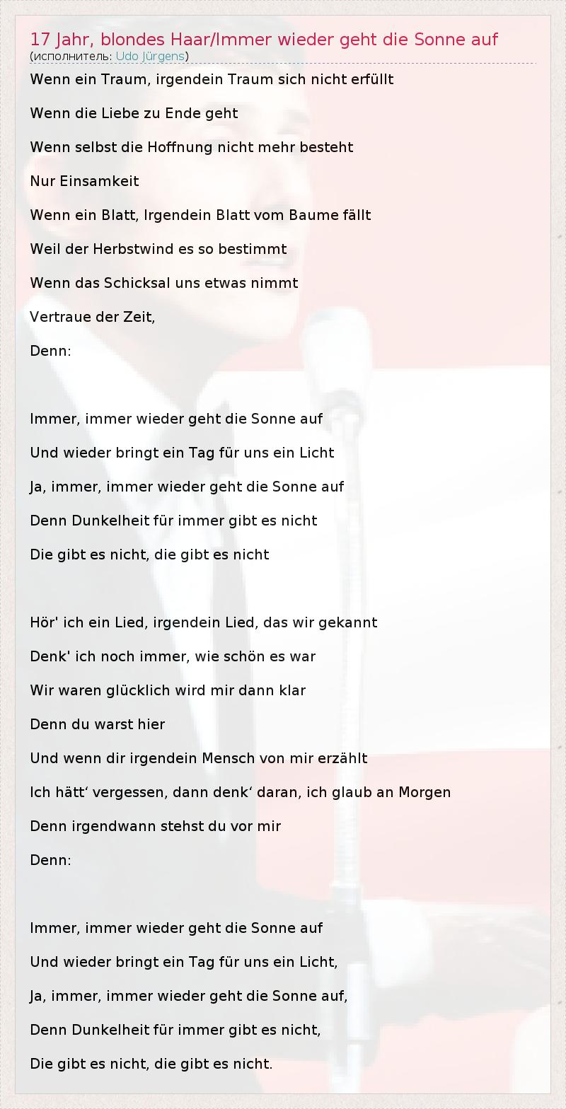 А как ты думаешь, о чем песня "17 Jahr, blondes Haar/Immer wieder geht die Sonne auf" ?