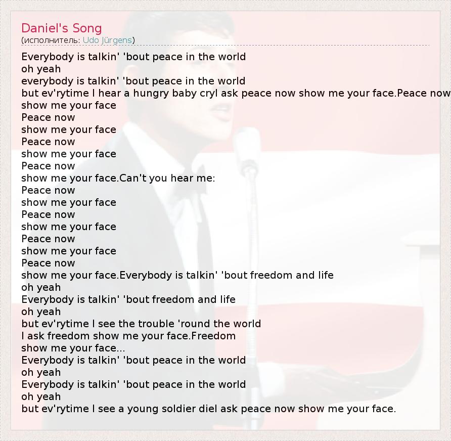 but ev'rytime I hear a hungry baby cryI ask peace now show me your face.Peace now