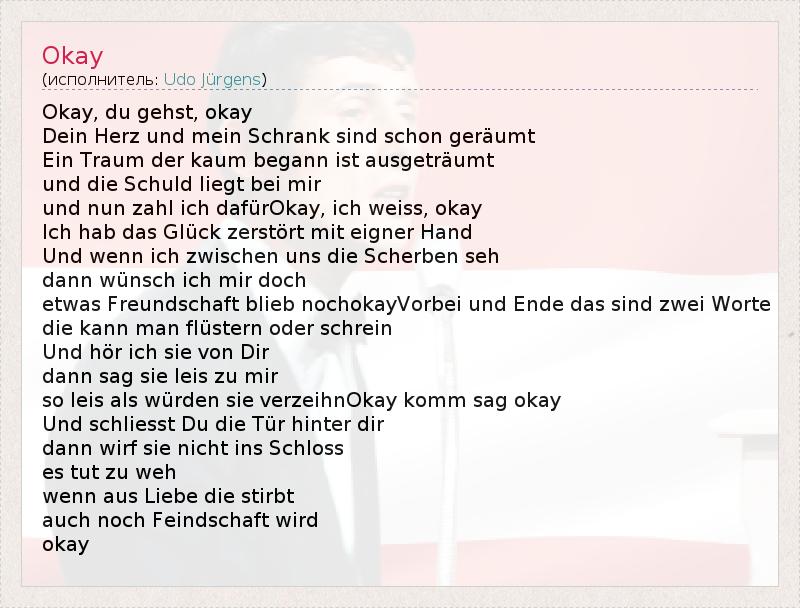 Это интересно:Удо Juergens родился в Клагенфурт, Каринтия, Австрия. В 1950 году композитор Юргенс выиграла конкурс, организованный в Австрии общественного вещания канала ORF с песней Je T'AIME. Он писал в 1961 году по всему миру хит досягаемости для звезды, поют Ширли Басси. В 1964 году он представлял Австрии впервые на конкурсе песни Евровидение с песней Почему только почему?, Отделочные пятый. Великобритания Участник... продолжение
