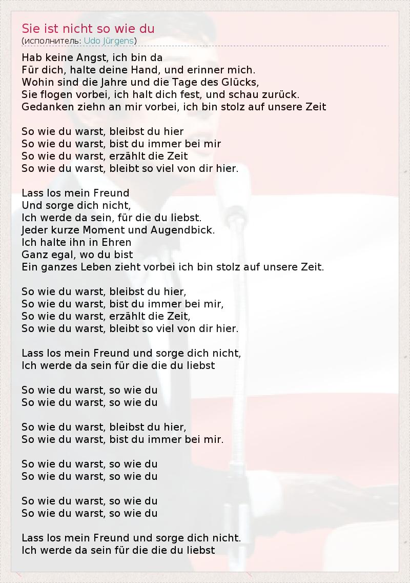 Hab keine Angst, ich bin da Für dich, halte deine Hand, und erinner mich. Wohin sind die Jahre und die Tage des Glücks, Sie flogen vorbei, ich halt dich fest, und schau zurück. Gedanken ziehn an mir vorbei, ich bin stolz auf unsere Zeit So wie du warst, bleibst du hier So wie du warst, bist du immer bei mir So wie du warst, erzählt die Zeit So wie du warst, bleibt so viel von dir hier. Lass los mein Freund Und sorge dich nicht, Ich werde da sein, für die du liebst. Jeder kurze Moment und Augendbick. Ich halte ihn in Ehren Ganz egal, wo du bist Ein ganzes Leben zieht vorbei ich bin stolz auf unsere Zeit. So wie du warst, bleibst du hier, So wie du warst, bist du immer bei mir, So wie du warst, erzählt die Zeit, So wie du warst, bleibt so viel von dir hier. Lass los mein Freund und sorge dich nicht, Ich werde da sein für die die du liebst So wie du warst, so wie du So wie du warst, so wie du So wie du warst, bleibst du hier, So wie du warst, bist du immer bei mir. So wie du warst, so wie du So wie du warst, so wie du So wie du warst, so wie du So wie du warst, so wie du Lass los mein Freund und sorge dich nicht. Ich werde da sein für die die du liebst