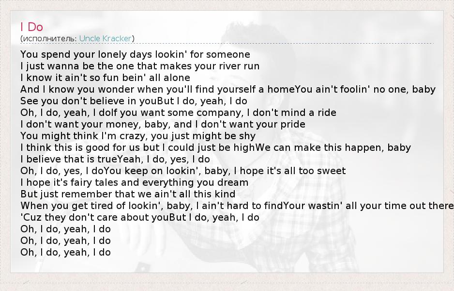 Это интересно:Uncle Kracker (настоящее имя Matthew Shafer) - американский рок-певец. Родился 9 ноября 1974 года в Мичигане. В 1987 году встретил Кид Рока, который попросил его стать ди-джеем. В середине 1990 годов Kracker занимался ди-джействованием в Детройте, в клубе The Pretty Woman. В 1999 году вышел дебютный альбом "Double Wide". Uncle Kracker участвовал в записи альбома Кид Рока "Cocky" в 2001 году. 16 ноября 2006 года началась работа над... продолжение
