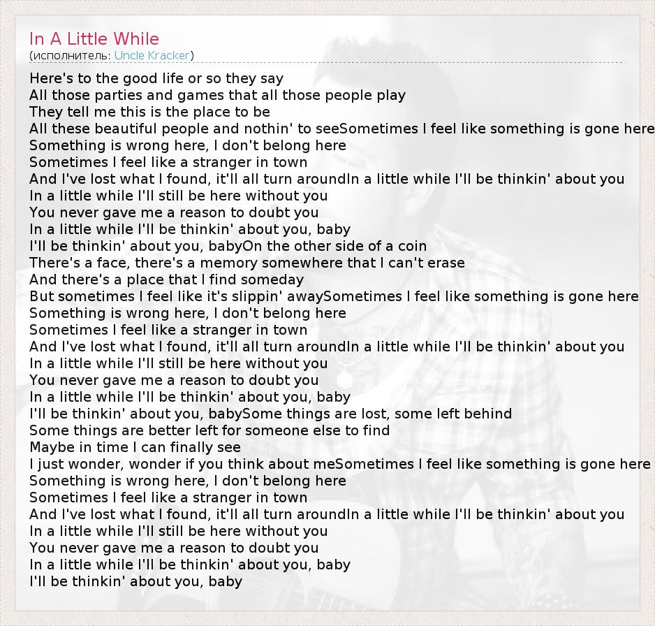 And I've lost what I found, it'll all turn aroundIn a little while I'll be thinkin' about you