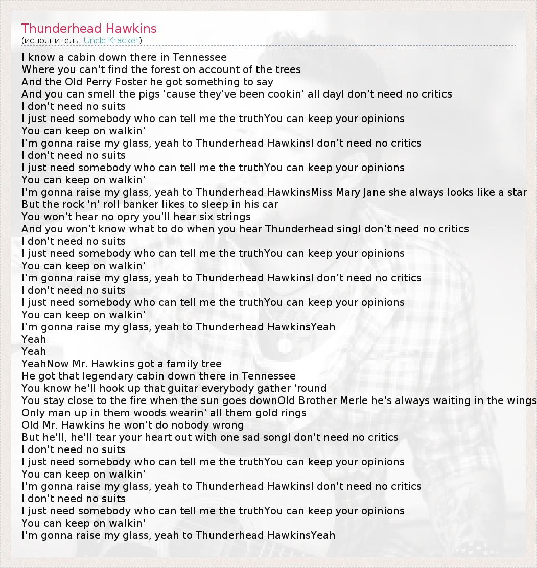 I'm gonna raise my glass, yeah to Thunderhead HawkinsI don't need no critics