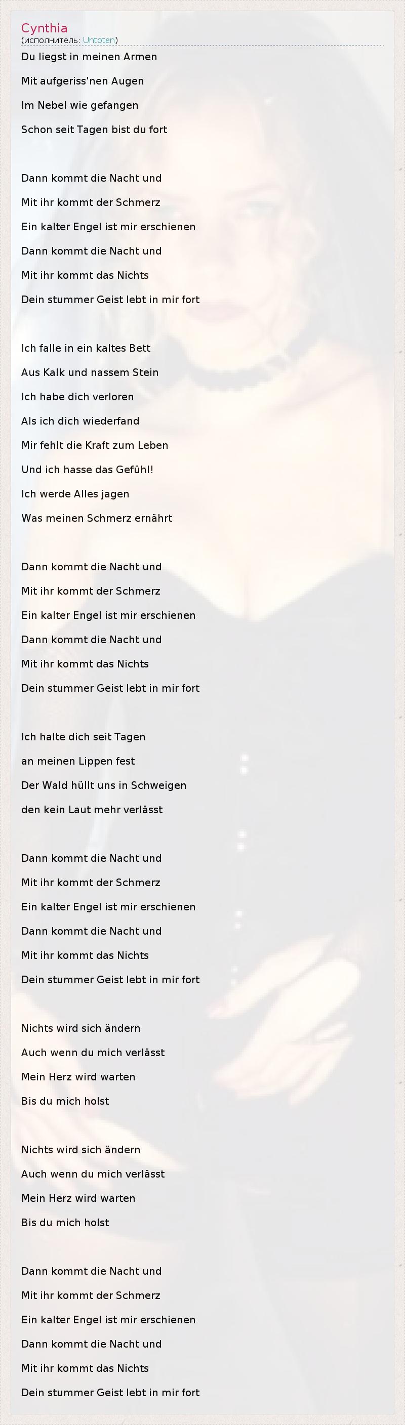 Это интересно:Untoten - (рус. Нежить) - немецкая группа из Берлина, начинавшая с grindcore, в течение нескольких лет перешедшая к darkwave. Является одной из самых ярких готических групп современной немецкой темной сцены. Наиболее значимыми работами для стиля darkwave являются: Vampire Book и The Look of Blasphemie, а для Gothic metal - трилогия Grabsteinland.... продолжение