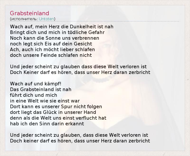 Wach auf, mein Herz die Dunkelheit ist nah Bringt dich und mich in tödliche Gefahr Noch kann die Sonne uns verbrennen noch legt sich Eis auf dein Gesicht Ach, auch ich möcht lieber schlafen doch unsere Feinde schlafen nicht Und jeder scheint zu glauben dass diese Welt verloren ist Doch Keiner darf es hören, dass unser Herz daran zerbricht Wach auf und kämpf! Das Grabsteinland ist nah führt dich und mich in eine Welt wie sie einst war Dort kann es unserer Spur nicht folgen dort liegt das Glück in unserer Hand denn als die Welt uns einst verflucht hat hab ich den Sinn darin erkannt Und jeder scheint zu glauben, dass diese Welt verloren ist Doch keiner darf es hören, dass unser Herz daran zerbricht