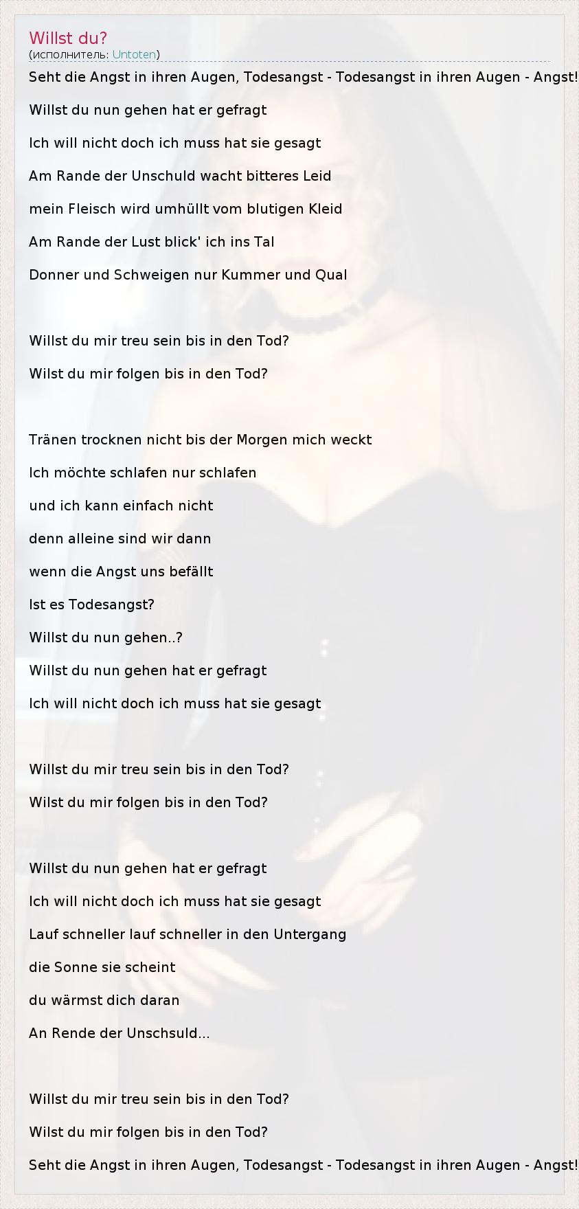 Это интересно:Untoten - (рус. Нежить) - немецкая группа из Берлина, начинавшая с grindcore, в течение нескольких лет перешедшая к darkwave. Является одной из самых ярких готических групп современной немецкой темной сцены. Наиболее значимыми работами для стиля darkwave являются: Vampire Book и The Look of Blasphemie, а для Gothic metal - трилогия Grabsteinland.... продолжение
