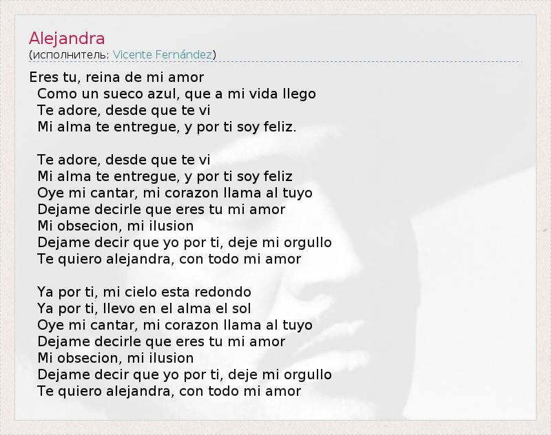 Eres tu, reina de mi amor Como un sueсo azul, que a mi vida llego Te adore, desde que te vi Mi alma te entregue, y por ti soy feliz. Te adore, desde que te vi Mi alma te entregue, y por ti soy feliz Oye mi cantar, mi corazon llama al tuyo Dejame decirle que eres tu mi amor Mi obsecion, mi ilusion Dejame decir que yo por ti, deje mi orgullo Te quiero alejandra, con todo mi amor Ya por ti, mi cielo esta redondo Ya por ti, llevo en el alma el sol Oye mi cantar, mi corazon llama al tuyo Dejame decirle que eres tu mi amor Mi obsecion, mi ilusion Dejame decir que yo por ti, deje mi orgullo Te quiero alejandra, con todo mi amor