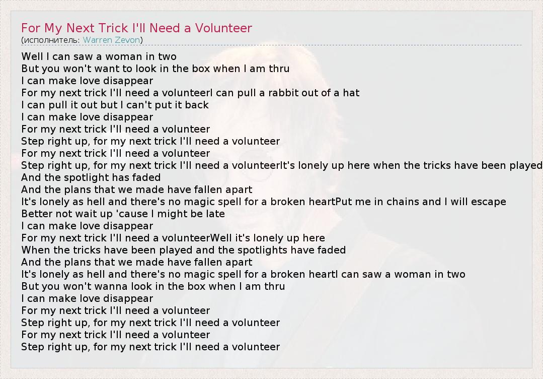 ГлавнаяИсполнителиWarren ZevonFor My Next Trick I'll Need a Volunteer