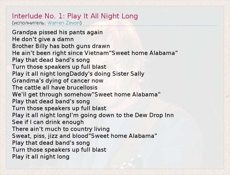 ГлавнаяИсполнителиWarren ZevonInterlude No. 1: Play It All Night Long