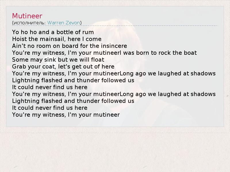 You're my witness, I'm your mutineerLong ago we laughed at shadows