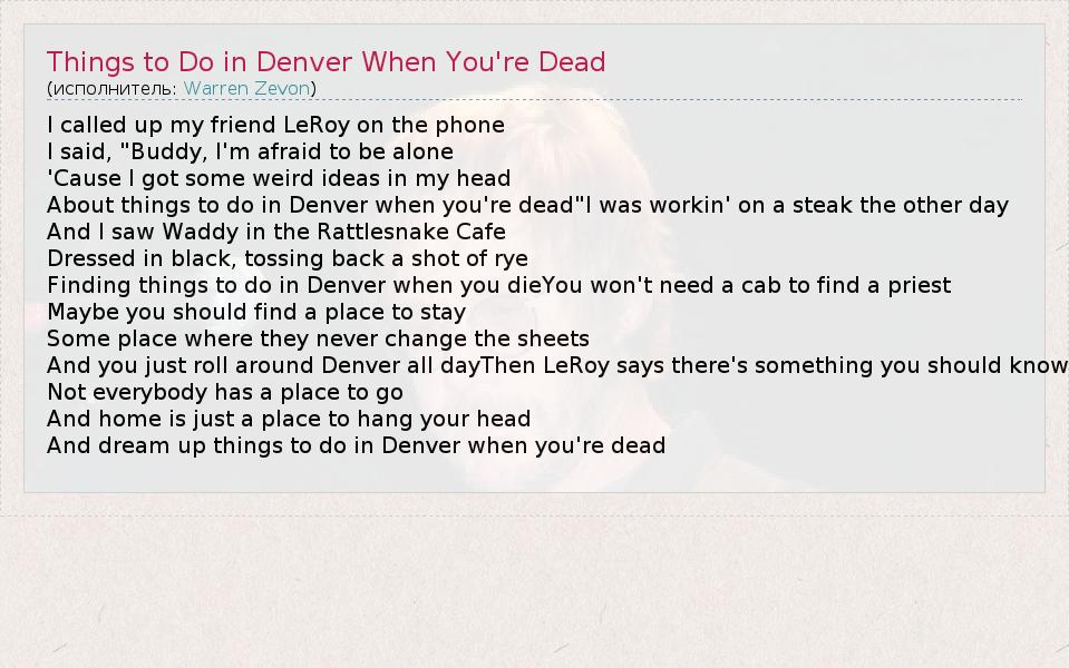 А как ты думаешь, о чем песня "Things to Do in Denver When You're Dead" ?