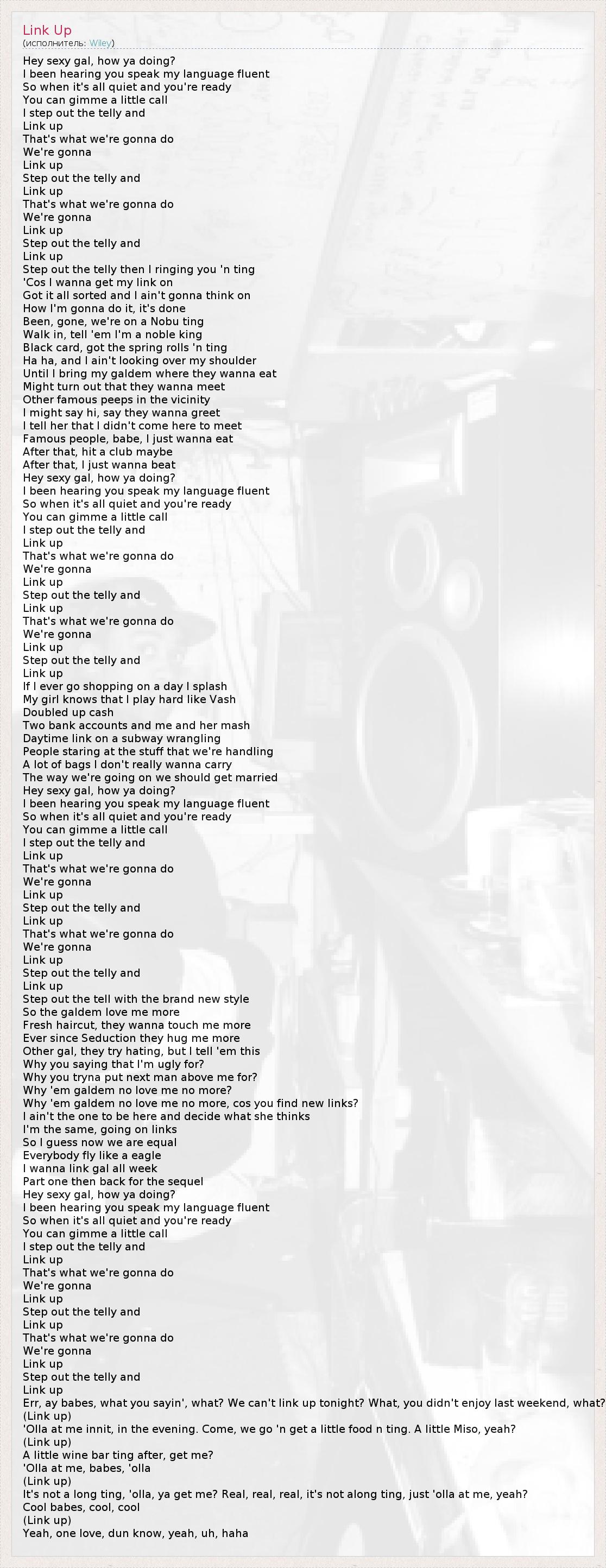 Hey sexy gal, how ya doing? I been hearing you speak my language fluent So when it's all quiet and you're ready You can gimme a little call I step out the telly and Link up That's what we're gonna do We're gonna Link up Step out the telly and Link up That's what we're gonna do We're gonna Link up Step out the telly and Link up Step out the telly then I ringing you 'n ting 'Cos I wanna get my link on Got it all sorted and I ain't gonna think on How I'm gonna do it, it's done Been, gone, we're on a Nobu ting Walk in, tell 'em I'm a noble king Black card, got the spring rolls 'n ting Ha ha, and I ain't looking over my shoulder Until I bring my galdem where they wanna eat Might turn out that they wanna meet Other famous peeps in the vicinity I might say hi, say they wanna greet I tell her that I didn't come here to meet Famous people, babe, I just wanna eat After that, hit a club maybe After that, I just wanna beat Hey sexy gal, how ya doing? I been hearing you speak my language fluent So when it's all quiet and you're ready You can gimme a little call I step out the telly and Link up That's what we're gonna do We're gonna Link up Step out the telly and Link up That's what we're gonna do We're gonna Link up Step out the telly and Link up If I ever go shopping on a day I splash My girl knows that I play hard like Vash Doubled up cash Two bank accounts and me and her mash Daytime link on a subway wrangling People staring at the stuff that we're handling A lot of bags I don't really wanna carry The way we're going on we should get married Hey sexy gal, how ya doing? I been hearing you speak my language fluent So when it's all quiet and you're ready You can gimme a little call I step out the telly and Link up That's what we're gonna do We're gonna Link up Step out the telly and Link up That's what we're gonna do We're gonna Link up Step out the telly and Link up Step out the tell with the brand new style So the galdem love me more Fresh haircut, they wanna touch me more Ever since Seduction they hug me more Other gal, they try hating, but I tell 'em this Why you saying that I'm ugly for? Why you tryna put next man above me for? Why 'em galdem no love me no more? Why 'em galdem no love me no more, cos you find new links? I ain't the one to be here and decide what she thinks I'm the same, going on links So I guess now we are equal Everybody fly like a eagle I wanna link gal all week Part one then back for the sequel Hey sexy gal, how ya doing? I been hearing you speak my language fluent So when it's all quiet and you're ready You can gimme a little call I step out the telly and Link up That's what we're gonna do We're gonna Link up Step out the telly and Link up That's what we're gonna do We're gonna Link up Step out the telly and Link up Err, ay babes, what you sayin', what? We can't link up tonight? What, you didn't enjoy last weekend, what? (Link up) 'Olla at me innit, in the evening. Come, we go 'n get a little food n ting. A little Miso, yeah? (Link up) A little wine bar ting after, get me? 'Olla at me, babes, 'olla (Link up) It's not a long ting, 'olla, ya get me? Real, real, real, it's not along ting, just 'olla at me, yeah? Cool babes, cool, cool (Link up) Yeah, one love, dun know, yeah, uh, haha