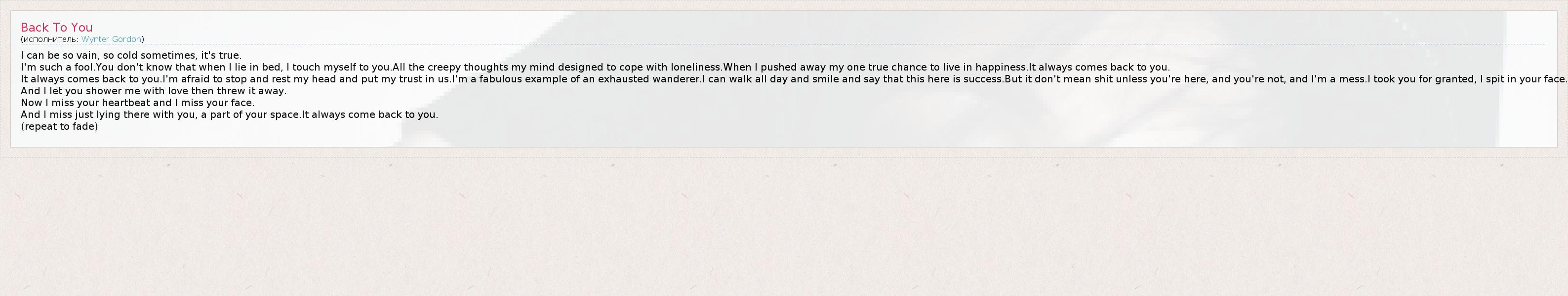 I'm such a fool.You don't know that when I lie in bed, I touch myself to you.All the creepy thoughts my mind designed to cope with loneliness.When I pushed away my one true chance to live in happiness.It always comes back to you.