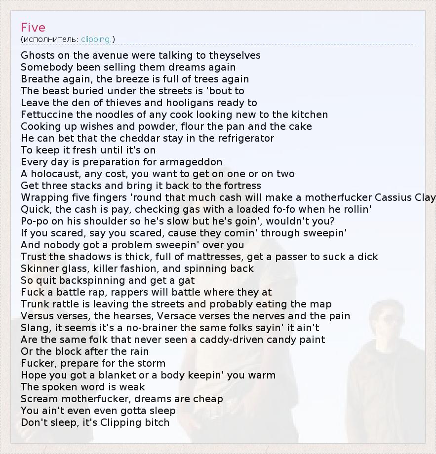 Это интересно:clipping. is a Los Angeles, United States rap trio formed in 2010 by William Hutson (Rale), film soundtrack composer Jonathan Snipes (ex-Captain Ahab) and vocalist Daveed Diggs.Lyrically, clipping.’s music attempts to reshuffle and repeat accepted rap scenarios, while eliminating a traditional single-point perspective. Diggs’s writing is heavily citational, like a rough-edged collage, gluing together half-glimpsed images and misremembered references, many of which might feel familiar, and some of which assuredly do not. But even while he consumes and regurgitates established styles, his self-erasure is incomplete; Diggs’s dense, often motormouthed flow remains wholly his own.Individually,... продолжение