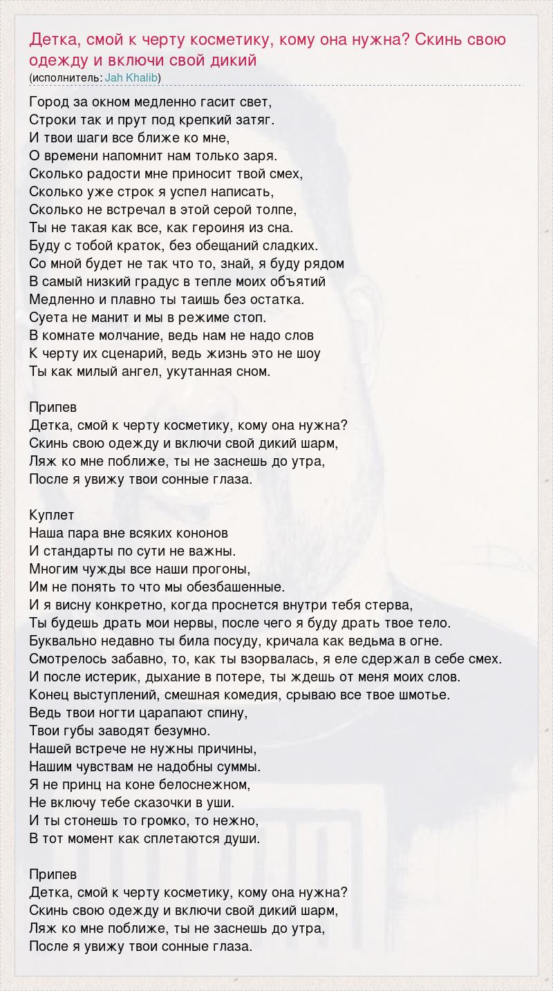 Главная→Исполнители→Jah Khalib→Детка, смой к черту косметику, кому она нужна? Скинь свою одежду и вкл