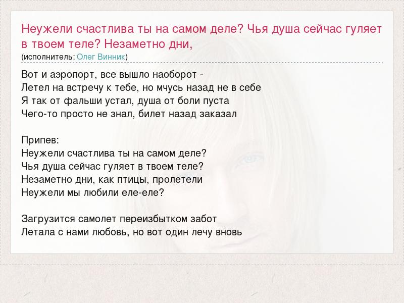 Главная→Исполнители→Олег Винник→Неужели счастлива ты на самом деле? Чья душа сейчас гуляет в твоем теле