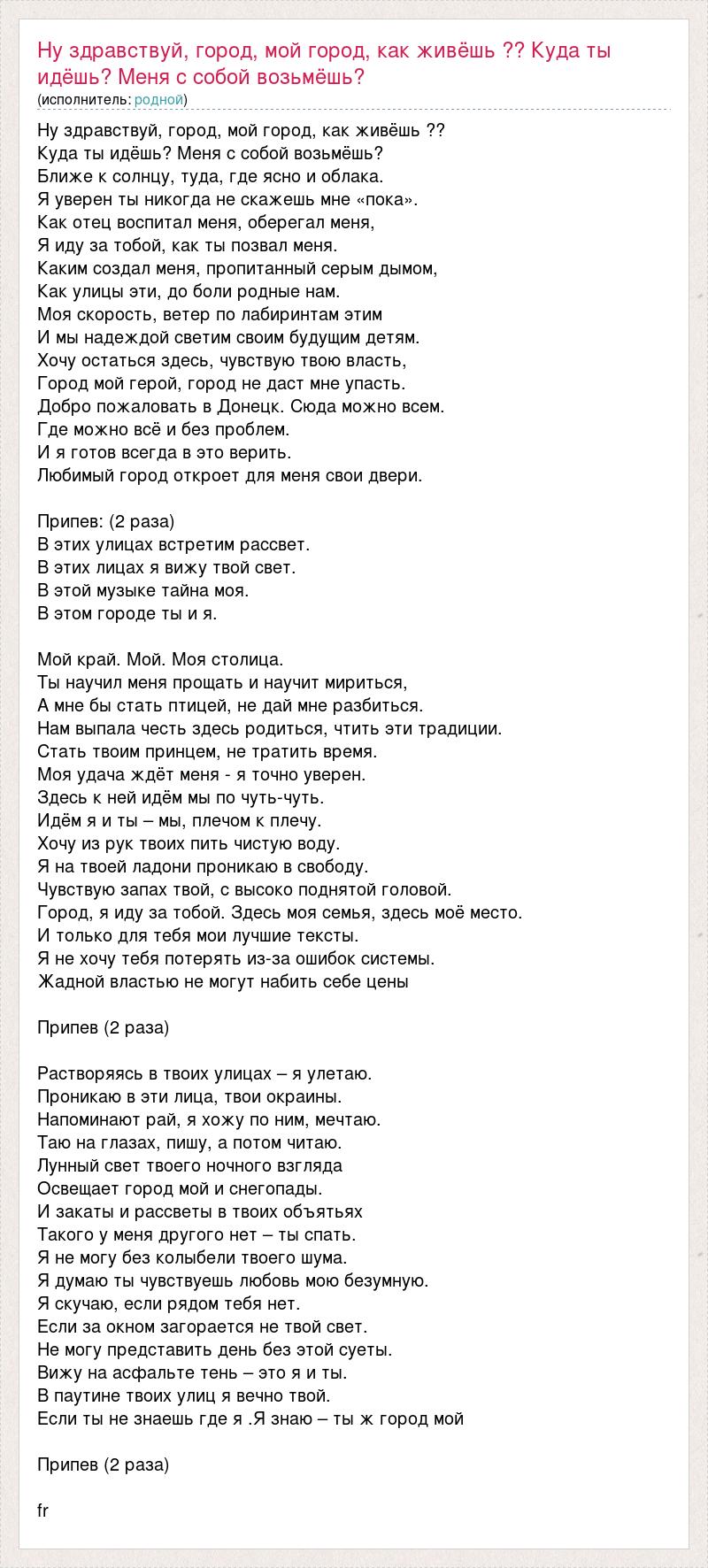 Ну здравствуй, город, мой город, как живёшь ?? Куда ты идёшь? Меня с собой возьмёшь? Ближе к солнцу, туда, где ясно и облака. Я уверен ты никогда не скажешь мне «пока». Как отец воспитал меня, оберегал меня, Я иду за тобой, как ты позвал меня. Каким создал меня, пропитанный серым дымом, Как улицы эти, до боли родные нам. Моя скорость, ветер по лабиринтам этим И мы надеждой светим своим будущим детям. Хочу остаться здесь, чувствую твою власть, Город мой герой, город не даст мне упасть. Добро пожаловать в Донецк. Сюда можно всем. Где можно всё и без проблем. И я готов всегда в это верить. Любимый город откроет для меня свои двери. Припев: (2 раза) В этих улицах встретим рассвет. В этих лицах я вижу твой свет. В этой музыке тайна моя. В этом городе ты и я. Мой край. Мой. Моя столица. Ты научил меня прощать и научит мириться, А мне бы стать птицей, не дай мне разбиться. Нам выпала честь здесь родиться, чтить эти традиции. Стать твоим принцем, не тратить время. Моя удача ждёт меня - я точно уверен. Здесь к ней идём мы по чуть-чуть. Идём я и ты – мы, плечом к плечу. Хочу из рук твоих пить чистую воду. Я на твоей ладони проникаю в свободу. Чувствую запах твой, с высоко поднятой головой. Город, я иду за тобой. Здесь моя семья, здесь моё место. И только для тебя мои лучшие тексты. Я не хочу тебя потерять из-за ошибок системы. Жадной властью не могут набить себе цены Припев (2 раза) Растворяясь в твоих улицах – я улетаю. Проникаю в эти лица, твои окраины. Напоминают рай, я хожу по ним, мечтаю. Таю на глазах, пишу, а потом читаю. Лунный свет твоего ночного взгляда Освещает город мой и снегопады. И закаты и рассветы в твоих объятьях Такого у меня другого нет – ты спать. Я не могу без колыбели твоего шума. Я думаю ты чувствуешь любовь мою безумную. Я скучаю, если рядом тебя нет. Если за окном загорается не твой свет. Не могу представить день без этой суеты. Вижу на асфальте тень – это я и ты. В паутине твоих улиц я вечно твой. Если ты не знаешь где я .Я знаю – ты ж город мой Припев (2 раза) fr