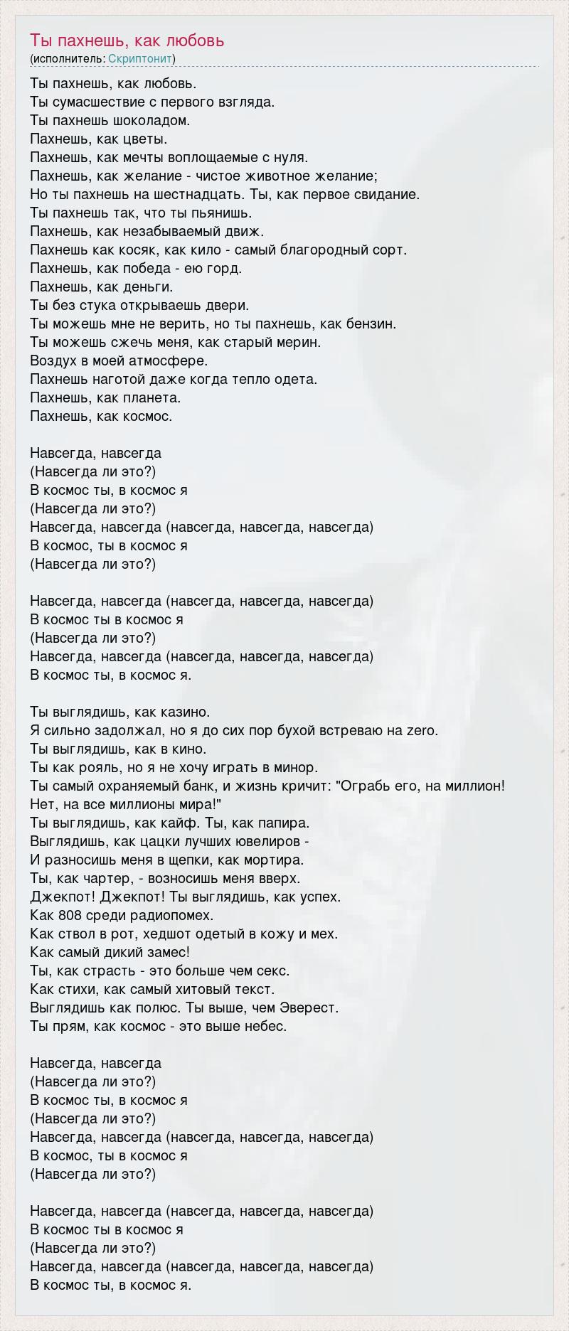 Ты пахнешь, как любовь. Ты сумасшествие с первого взгляда. Ты пахнешь шоколадом. Пахнешь, как цветы. Пахнешь, как мечты воплощаемые с нуля. Пахнешь, как желание - чистое животное желание; Но ты пахнешь на шестнадцать. Ты, как первое свидание. Ты пахнешь так, что ты пьянишь. Пахнешь, как незабываемый движ. Пахнешь как косяк, как кило - самый благородный сорт. Пахнешь, как победа - ею горд. Пахнешь, как деньги. Ты без стука открываешь двери. Ты можешь мне не верить, но ты пахнешь, как бензин. Ты можешь сжечь меня, как старый мерин. Воздух в моей атмосфере. Пахнешь наготой даже когда тепло одета. Пахнешь, как планета. Пахнешь, как космос. Навсегда, навсегда (Навсегда ли это?) В космос ты, в космос я (Навсегда ли это?) Навсегда, навсегда (навсегда, навсегда, навсегда) В космос, ты в космос я (Навсегда ли это?) Навсегда, навсегда (навсегда, навсегда, навсегда) В космос ты в космос я (Навсегда ли это?) Навсегда, навсегда (навсегда, навсегда, навсегда) В космос ты, в космос я. Ты выглядишь, как казино. Я сильно задолжал, но я до сих пор бухой встреваю на zero. Ты выглядишь, как в кино. Ты как рояль, но я не хочу играть в минор. Ты самый охраняемый банк, и жизнь кричит: "Ограбь его, на миллион! Нет, на все миллионы мира!" Ты выглядишь, как кайф. Ты, как папира. Выглядишь, как цацки лучших ювелиров - И разносишь меня в щепки, как мортира. Ты, как чартер, - возносишь меня вверх. Джекпот! Джекпот! Ты выглядишь, как успех. Как 808 среди радиопомех. Как ствол в рот, хедшот одетый в кожу и мех. Как самый дикий замес! Ты, как страсть - это больше чем секс. Как стихи, как самый хитовый текст. Выглядишь как полюс. Ты выше, чем Эверест. Ты прям, как космос - это выше небес. Навсегда, навсегда (Навсегда ли это?) В космос ты, в космос я (Навсегда ли это?) Навсегда, навсегда (навсегда, навсегда, навсегда) В космос, ты в космос я (Навсегда ли это?) Навсегда, навсегда (навсегда, навсегда, навсегда) В космос ты в космос я (Навсегда ли это?) Навсегда, навсегда (навсегда, навсегда, навсегда) В космос ты, в космос я.