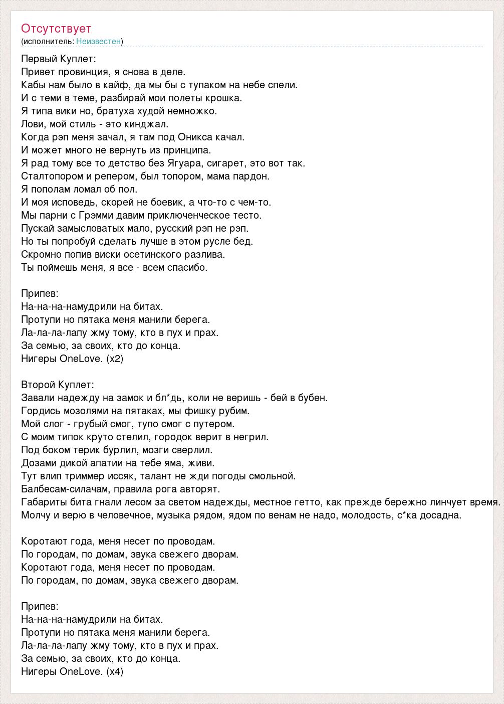 Первый Куплет: Привет провинция, я снова в деле. Кабы нам было в кайф, да мы бы с тупаком на небе спели. И с теми в теме, разбирай мои полеты крошка. Я типа вики но, братуха худой немножко. Лови, мой стиль - это кинджал. Когда рэп меня зачал, я там под Оникса качал. И может много не вернуть из принципа. Я рад тому все то детство без Ягуара, сигарет, это вот так. Сталтопором и репером, был топором, мама пардон. Я пополам ломал об пол. И моя исповедь, скорей не боевик, а что-то с чем-то. Мы парни с Грэмми давим приключенческое тесто. Пускай замысловатых мало, русский рэп не рэп. Но ты попробуй сделать лучше в этом русле бед. Скромно попив виски осетинского разлива. Ты поймешь меня, я все - всем спасибо. Припев: На-на-на-намудрили на битах. Протупи но пятака меня манили берега. Ла-ла-ла-лапу жму тому, кто в пух и прах. За семью, за своих, кто до конца. Нигеры OneLove. (х2) Второй Куплет: Завали надежду на замок и бл*дь, коли не веришь - бей в бубен. Гордись мозолями на пятаках, мы фишку рубим. Мой слог - грубый смог, тупо смог с путером. С моим типок круто стелил, городок верит в негрил. Под боком терик бурлил, мозги сверлил. Дозами дикой апатии на тебе яма, живи. Тут влип триммер иссяк, талант не жди погоды смольной. Балбесам-силачам, правила рога авторят. Габариты бита гнали лесом за светом надежды, местное гетто, как прежде бережно линчует время. Молчу и верю в человечное, музыка рядом, ядом по венам не надо, молодость, с*ка досадна. Коротают года, меня несет по проводам. По городам, по домам, звука свежего дворам. Коротают года, меня несет по проводам. По городам, по домам, звука свежего дворам. Припев: На-на-на-намудрили на битах. Протупи но пятака меня манили берега. Ла-ла-ла-лапу жму тому, кто в пух и прах. За семью, за своих, кто до конца. Нигеры OneLove. (х4)