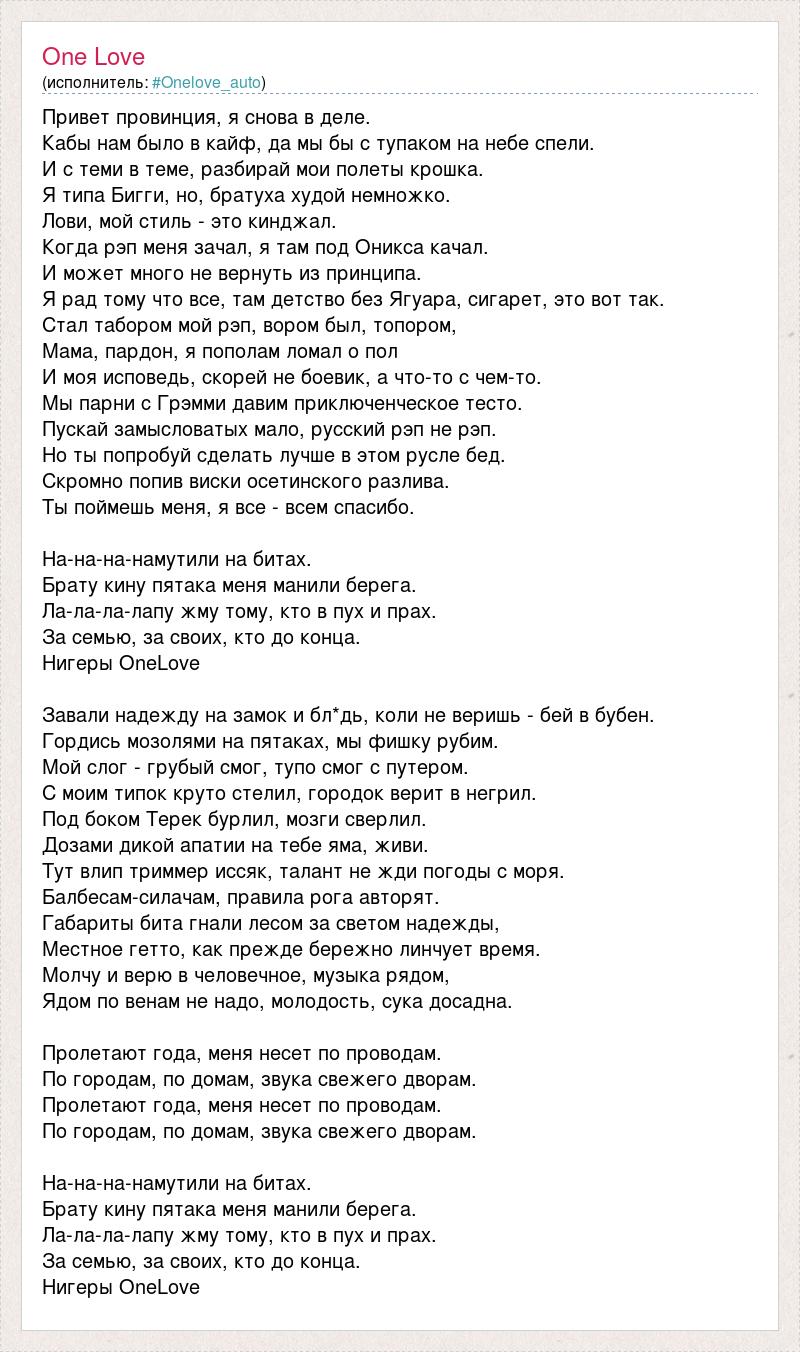 Привет провинция, я снова в деле. Кабы нам было в кайф, да мы бы с тупаком на небе спели. И с теми в теме, разбирай мои полеты крошка. Я типа Бигги, но, братуха худой немножко. Лови, мой стиль - это кинджал. Когда рэп меня зачал, я там под Оникса качал. И может много не вернуть из принципа. Я рад тому что все, там детство без Ягуара, сигарет, это вот так. Стал табором мой рэп, вором был, топором, Мама, пардон, я пополам ломал о пол И моя исповедь, скорей не боевик, а что-то с чем-то. Мы парни с Грэмми давим приключенческое тесто. Пускай замысловатых мало, русский рэп не рэп. Но ты попробуй сделать лучше в этом русле бед. Скромно попив виски осетинского разлива. Ты поймешь меня, я все - всем спасибо. На-на-на-намутили на битах. Брату кину пятака меня манили берега. Ла-ла-ла-лапу жму тому, кто в пух и прах. За семью, за своих, кто до конца. Нигеры OneLove Завали надежду на замок и бл*дь, коли не веришь - бей в бубен. Гордись мозолями на пятаках, мы фишку рубим. Мой слог - грубый смог, тупо смог с путером. С моим типок круто стелил, городок верит в негрил. Под боком Терек бурлил, мозги сверлил. Дозами дикой апатии на тебе яма, живи. Тут влип триммер иссяк, талант не жди погоды с моря. Балбесам-силачам, правила рога авторят. Габариты бита гнали лесом за светом надежды, Местное гетто, как прежде бережно линчует время. Молчу и верю в человечное, музыка рядом, Ядом по венам не надо, молодость, сука досадна. Пролетают года, меня несет по проводам. По городам, по домам, звука свежего дворам. Пролетают года, меня несет по проводам. По городам, по домам, звука свежего дворам. На-на-на-намутили на битах. Брату кину пятака меня манили берега. Ла-ла-ла-лапу жму тому, кто в пух и прах. За семью, за своих, кто до конца. Нигеры OneLove