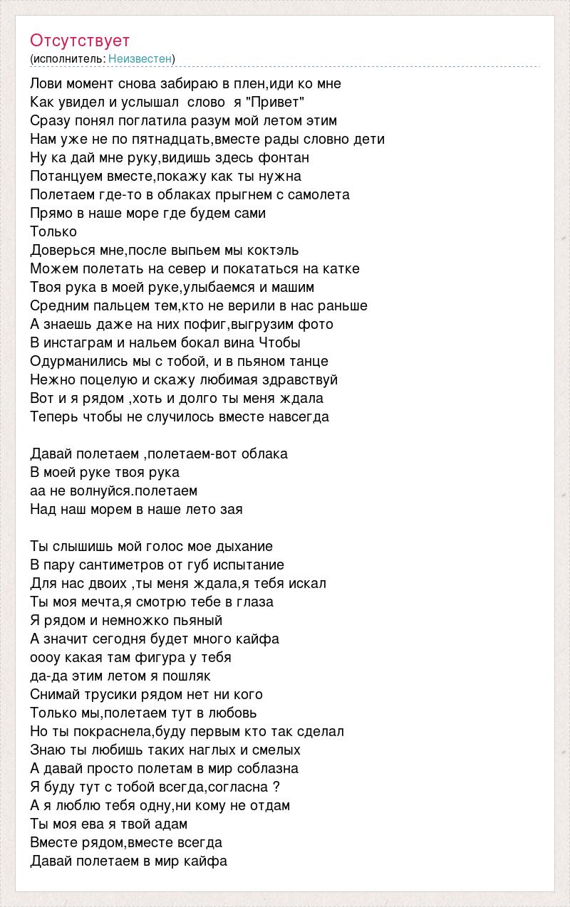Лови момент снова забираю в плен,иди ко мне Как увидел и услышал слово я "Привет" Сразу понял поглатила разум мой летом этим Нам уже не по пятнадцать,вместе рады словно дети Ну ка дай мне руку,видишь здесь фонтан Потанцуем вместе,покажу как ты нужна Полетаем где-то в облаках прыгнем с самолета Прямо в наше море где будем сами Только Доверься мне,после выпьем мы коктэль Можем полетать на север и покататься на катке Твоя рука в моей руке,улыбаемся и машим Средним пальцем тем,кто не верили в нас раньше А знаешь даже на них пофиг,выгрузим фото В инстаграм и нальем бокал вина Чтобы Одурманились мы с тобой, и в пьяном танце Нежно поцелую и скажу любимая здравствуй Вот и я рядом ,хоть и долго ты меня ждала Теперь чтобы не случилось вместе навсегда Давай полетаем ,полетаем-вот облака В моей руке твоя рука аа не волнуйся.полетаем Над наш морем в наше лето зая Ты слышишь мой голос мое дыхание В пару сантиметров от губ испытание Для нас двоих ,ты меня ждала,я тебя искал Ты моя мечта,я смотрю тебе в глаза Я рядом и немножко пьяный А значит сегодня будет много кайфа оооу какая там фигура у тебя да-да этим летом я пошляк Снимай трусики рядом нет ни кого Только мы,полетаем тут в любовь Но ты покраснела,буду первым кто так сделал Знаю ты любишь таких наглых и смелых А давай просто полетам в мир соблазна Я буду тут с тобой всегда,согласна ? А я люблю тебя одну,ни кому не отдам Ты моя ева я твой адам Вместе рядом,вместе всегда Давай полетаем в мир кайфа