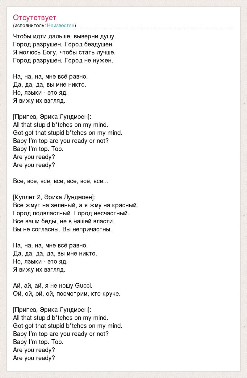 Чтобы идти дальше, выверни душу. Город разрушен. Город бездушен. Я молюсь Богу, чтобы стать лучше. Город разрушен. Город не нужен. На, на, на, мне всё равно. Да, да, да, вы мне никто. Но, языки - это яд. Я вижу их взгляд. [Припев, Эрика Лундмоен]: All that stupid b*tches on my mind. Got got that stupid b*tches on my mind. Baby I’m top are you ready or not? Baby I’m top. Top. Are you ready? Are you ready? Все, все, все, все, все, все, все... [Куплет 2, Эрика Лундмоен]: Все жмут на зелёный, а я жму на красный. Город подвластный. Город несчастный. Все ваши беды, не в нашей власти. Вы не согласны. Вы непричастны. На, на, на, мне всё равно. Да, да, да, да, вы мне никто. Но, языки - это яд. Я вижу их взгляд. Ай, ай, ай, я не ношу Gucci. Ой, ой, ой, ой, посмотрим, кто круче. [Припев, Эрика Лундмоен]: All that stupid b*tches on my mind. Got got that stupid b*tches on my mind. Baby I’m top are you ready or not? Baby I’m top. Top. Are you ready? Are you ready?