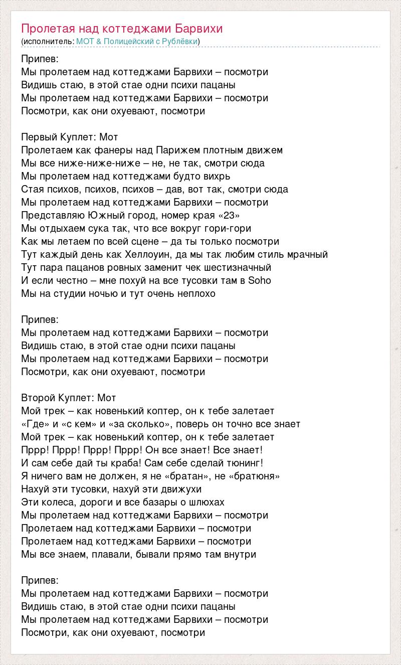 Припев: Мы пролетаем над коттеджами Барвихи – посмотри Видишь стаю, в этой стае одни психи пацаны Мы пролетаем над коттеджами Барвихи – посмотри Посмотри, как они охуевают, посмотри Первый Куплет: Мот Пролетаем как фанеры над Парижем плотным движем Мы все ниже-ниже-ниже – не, не так, смотри сюда Мы пролетаем над коттеджами будто вихрь Стая психов, психов, психов – дав, вот так, смотри сюда Мы пролетаем над коттеджами Барвихи – посмотри Представляю Южный город, номер края «23» Мы отдыхаем сука так, что все вокруг гори-гори Как мы летаем по всей сцене – да ты только посмотри Тут каждый день как Хеллоуин, да мы так любим стиль мрачный Тут пара пацанов ровных заменит чек шестизначный И если честно – мне похуй на все тусовки там в Soho Мы на студии ночью и тут очень неплохо Припев: Мы пролетаем над коттеджами Барвихи – посмотри Видишь стаю, в этой стае одни психи пацаны Мы пролетаем над коттеджами Барвихи – посмотри Посмотри, как они охуевают, посмотри Второй Куплет: Мот Мой трек – как новенький коптер, он к тебе залетает «Где» и «с кем» и «за сколько», поверь он точно все знает Мой трек – как новенький коптер, он к тебе залетает Пррр! Пррр! Пррр! Пррр! Он все знает! Все знает! И сам себе дай ты краба! Сам себе сделай тюнинг! Я ничего вам не должен, я не «братан», не «братюня» Нахуй эти тусовки, нахуй эти движухи Эти колеса, дороги и все базары о шлюхах Мы пролетаем над коттеджами Барвихи – посмотри Пролетаем над коттеджами Барвихи – посмотри Пролетаем над коттеджами Барвихи – посмотри Мы все знаем, плавали, бывали прямо там внутри Припев: Мы пролетаем над коттеджами Барвихи – посмотри Видишь стаю, в этой стае одни психи пацаны Мы пролетаем над коттеджами Барвихи – посмотри Посмотри, как они охуевают, посмотри
