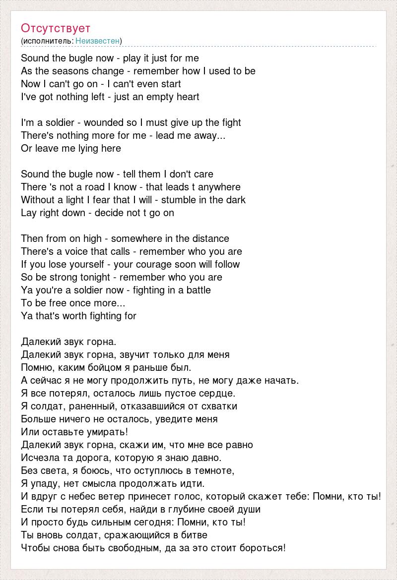 Sound the bugle now - play it just for me As the seasons change - remember how I used to be Now I can't go on - I can't even start I've got nothing left - just an empty heart I'm a soldier - wounded so I must give up the fight There's nothing more for me - lead me away... Or leave me lying here Sound the bugle now - tell them I don't care There 's not a road I know - that leads t anywhere Without a light I fear that I will - stumble in the dark Lay right down - decide not t go on Then from on high - somewhere in the distance There's a voice that calls - remember who you are If you lose yourself - your courage soon will follow So be strong tonight - remember who you are Ya you're a soldier now - fighting in a battle To be free once more... Ya that's worth fighting for Далекий звук горна. Далекий звук горна, звучит только для меня Помню, каким бойцом я раньше был. А сейчас я не могу продолжить путь, не могу даже начать. Я все потерял, осталось лишь пустое сердце. Я солдат, раненный, отказавшийся от схватки Больше ничего не осталось, уведите меня Или оставьте умирать! Далекий звук горна, скажи им, что мне все равно Исчезла та дорога, которую я знаю давно. Без света, я боюсь, что оступлюсь в темноте, Я упаду, нет смысла продолжать идти. И вдруг с небес ветер принесет голос, который скажет тебе: Помни, кто ты! Если ты потерял себя, найди в глубине своей души И просто будь сильным сегодня: Помни, кто ты! Ты вновь солдат, сражающийся в битве Чтобы снова быть свободным, да за это стоит бороться!
