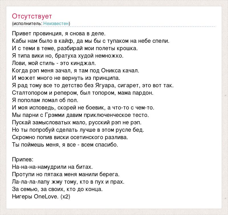 Привет провинция, я снова в деле. Кабы нам было в кайф, да мы бы с тупаком на небе спели. И с теми в теме, разбирай мои полеты крошка. Я типа вики но, братуха худой немножко. Лови, мой стиль - это кинджал. Когда рэп меня зачал, я там под Оникса качал. И может много не вернуть из принципа. Я рад тому все то детство без Ягуара, сигарет, это вот так. Сталтопором и репером, был топором, мама пардон. Я пополам ломал об пол. И моя исповедь, скорей не боевик, а что-то с чем-то. Мы парни с Грэмми давим приключенческое тесто. Пускай замысловатых мало, русский рэп не рэп. Но ты попробуй сделать лучше в этом русле бед. Скромно попив виски осетинского разлива. Ты поймешь меня, я все - всем спасибо. Припев: На-на-на-намудрили на битах. Протупи но пятака меня манили берега. Ла-ла-ла-лапу жму тому, кто в пух и прах. За семью, за своих, кто до конца. Нигеры OneLove. (х2)