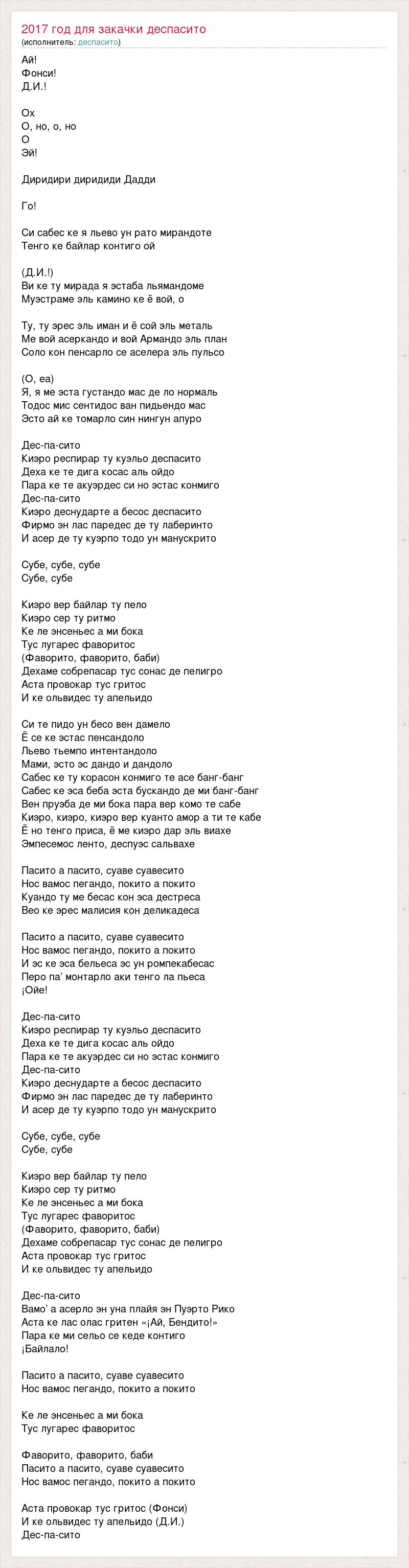 Ай! Фонси! Д.И.! Ох О, но, о, но О Эй! Диридири диридиди Дадди Го! Си сабес ке я льево ун рато мирандоте Тенго ке байлар контиго ой (Д.И.!) Ви ке ту мирада я эстаба льямандоме Муэстраме эль камино ке ё вой, о Ту, ту эрес эль иман и ё сой эль металь Ме вой асеркандо и вой Армандо эль план Соло кон пенсарло се аселера эль пульсо (О, еа) Я, я ме эста густандо мас де ло нормаль Тодос мис сентидос ван пидьендо мас Эсто ай ке томарло син нингун апуро Дес-па-сито Киэро респирар ту куэльо деспасито Деха ке те дига косас аль ойдо Пара ке те акуэрдес си но эстас конмиго Дес-па-сито Киэро деснударте а бесос деспасито Фирмо эн лас паредес де ту лаберинто И асер де ту куэрпо тодо ун манускрито Субе, субе, субе Субе, субе Киэро вер байлар ту пело Киэро сер ту ритмо Ке ле энсеньес а ми бока Тус лугарес фаворитос (Фаворито, фаворито, баби) Дехаме собрепасар тус сонас де пелигро Аста провокар тус гритос И ке ольвидес ту апельидо Си те пидо ун бесо вен дамело Ё се ке эстас пенсандоло Льево тьемпо интентандоло Мами, эсто эс дандо и дандоло Сабес ке ту корасон конмиго те асе банг-банг Сабес ке эса беба эста бускандо де ми банг-банг Вен пруэба де ми бока пара вер комо те сабе Киэро, киэро, киэро вер куанто амор а ти те кабе Ё но тенго приса, ё ме киэро дар эль виахе Эмпесемос ленто, деспуэс сальвахе Пасито а пасито, суаве суавесито Нос вамос пегандо, покито а покито Куандо ту ме бесас кон эса дестреса Вео ке эрес малисия кон деликадеса Пасито а пасито, суаве суавесито Нос вамос пегандо, покито а покито И эс ке эса бельеса эс ун ромпекабесас Перо па’ монтарло аки тенго ла пьеса ¡Ойе! Дес-па-сито Киэро респирар ту куэльо деспасито Деха ке те дига косас аль ойдо Пара ке те акуэрдес си но эстас конмиго Дес-па-сито Киэро деснударте а бесос деспасито Фирмо эн лас паредес де ту лаберинто И асер де ту куэрпо тодо ун манускрито Субе, субе, субе Субе, субе Киэро вер байлар ту пело Киэро сер ту ритмо Ке ле энсеньес а ми бока Тус лугарес фаворитос (Фаворито, фаворито, баби) Дехаме собрепасар тус сонас де пелигро Аста провокар тус гритос И ке ольвидес ту апельидо Дес-па-сито Вамо’ а асерло эн уна плайя эн Пуэрто Рико Аста ке лас олас гритен «¡Ай, Бендито!» Пара ке ми сельо се кеде контиго ¡Байлало! Пасито а пасито, суаве суавесито Нос вамос пегандо, покито а покито Ке ле энсеньес а ми бока Тус лугарес фаворитос Фаворито, фаворито, баби Пасито а пасито, суаве суавесито Нос вамос пегандо, покито а покито Аста провокар тус гритос (Фонси) И ке ольвидес ту апельидо (Д.И.) Дес-па-сито