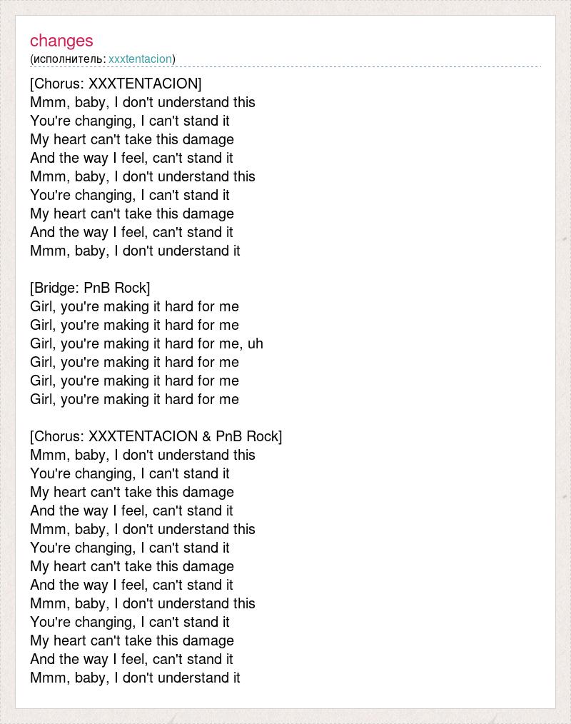 [Chorus: XXXTENTACION] Mmm, baby, I don't understand this You're changing, I can't stand it My heart can't take this damage And the way I feel, can't stand it Mmm, baby, I don't understand this You're changing, I can't stand it My heart can't take this damage And the way I feel, can't stand it Mmm, baby, I don't understand it [Bridge: PnB Rock] Girl, you're making it hard for me Girl, you're making it hard for me Girl, you're making it hard for me, uh Girl, you're making it hard for me Girl, you're making it hard for me Girl, you're making it hard for me [Chorus: XXXTENTACION & PnB Rock] Mmm, baby, I don't understand this You're changing, I can't stand it My heart can't take this damage And the way I feel, can't stand it Mmm, baby, I don't understand this You're changing, I can't stand it My heart can't take this damage And the way I feel, can't stand it Mmm, baby, I don't understand this You're changing, I can't stand it My heart can't take this damage And the way I feel, can't stand it Mmm, baby, I don't understand it