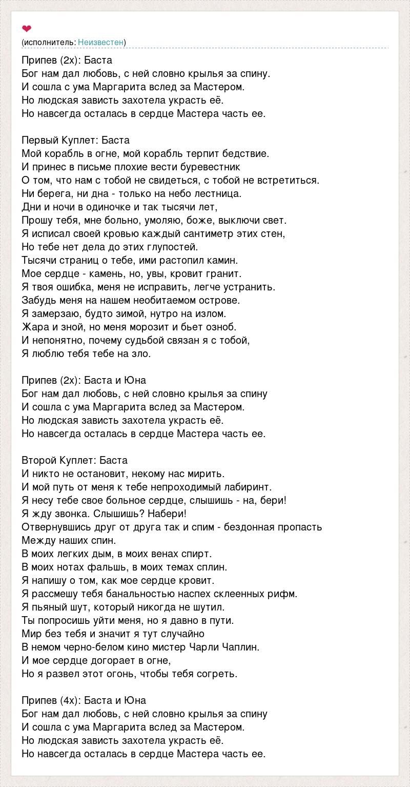 Припев (2x): Баста Бог нам дал любовь, с ней словно крылья за спину. И сошла с ума Маргарита вслед за Мастером. Но людская зависть захотела украсть её. Но навсегда осталась в сердце Мастера часть ее. Первый Куплет: Баста Мой корабль в огне, мой корабль терпит бедствие. И принес в письме плохие вести буревестник О том, что нам с тобой не свидеться, с тобой не встретиться. Ни берега, ни дна - только на небо лестница. Дни и ночи в одиночке и так тысячи лет, Прошу тебя, мне больно, умоляю, боже, выключи свет. Я исписал своей кровью каждый сантиметр этих стен, Но тебе нет дела до этих глупостей. Тысячи страниц о тебе, ими растопил камин. Мое сердце - камень, но, увы, кровит гранит. Я твоя ошибка, меня не исправить, легче устранить. Забудь меня на нашем необитаемом острове. Я замерзаю, будто зимой, нутро на излом. Жара и зной, но меня морозит и бьет озноб. И непонятно, почему судьбой связан я с тобой, Я люблю тебя тебе на зло. Припев (2x): Баста и Юна Бог нам дал любовь, с ней словно крылья за спину И сошла с ума Маргарита вслед за Мастером. Но людская зависть захотела украсть её. Но навсегда осталась в сердце Мастера часть ее. Второй Куплет: Баста И никто не остановит, некому нас мирить. И мой путь от меня к тебе непроходимый лабиринт. Я несу тебе свое больное сердце, слышишь - на, бери! Я жду звонка. Слышишь? Набери! Отвернувшись друг от друга так и спим - бездонная пропасть Между наших спин. В моих легких дым, в моих венах спирт. В моих нотах фальшь, в моих темах сплин. Я напишу о том, как мое сердце кровит. Я рассмешу тебя банальностью наспех склеенных рифм. Я пьяный шут, который никогда не шутил. Ты попросишь уйти меня, но я давно в пути. Мир без тебя и значит я тут случайно В немом черно-белом кино мистер Чарли Чаплин. И мое сердце догорает в огне, Но я развел этот огонь, чтобы тебя согреть. Припев (4x): Баста и Юна Бог нам дал любовь, с ней словно крылья за спину И сошла с ума Маргарита вслед за Мастером. Но людская зависть захотела украсть её. Но навсегда осталась в сердце Мастера часть ее.
