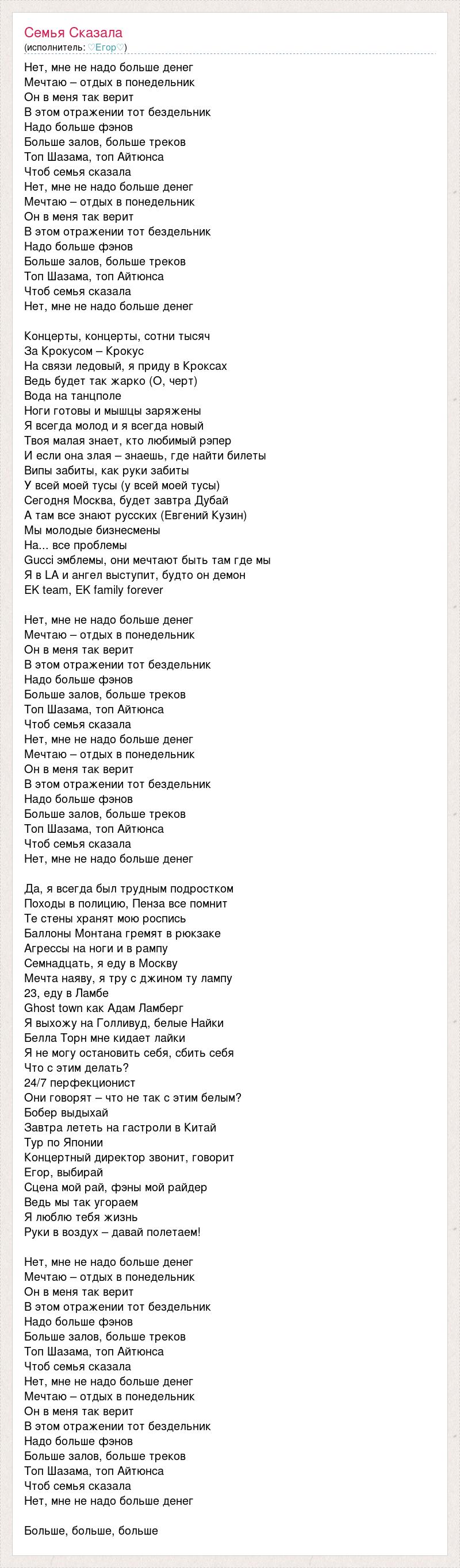 Нет, мне не надо больше денег Мечтаю – отдых в понедельник Он в меня так верит В этом отражении тот бездельник Надо больше фэнов Больше залов, больше треков Топ Шазама, топ Айтюнса Чтоб семья сказала Нет, мне не надо больше денег Мечтаю – отдых в понедельник Он в меня так верит В этом отражении тот бездельник Надо больше фэнов Больше залов, больше треков Топ Шазама, топ Айтюнса Чтоб семья сказала Нет, мне не надо больше денег Концерты, концерты, сотни тысяч За Крокусом – Крокус На связи ледовый, я приду в Кроксах Ведь будет так жарко (О, черт) Вода на танцполе Ноги готовы и мышцы заряжены Я всегда молод и я всегда новый Твоя малая знает, кто любимый рэпер И если она злая – знаешь, где найти билеты Випы забиты, как руки забиты У всей моей тусы (у всей моей тусы) Сегодня Москва, будет завтра Дубай А там все знают русских (Евгений Кузин) Мы молодые бизнесмены На... все проблемы Gucci эмблемы, они мечтают быть там где мы Я в LA и ангел выступит, будто он демон EK team, EK family forever Нет, мне не надо больше денег Мечтаю – отдых в понедельник Он в меня так верит В этом отражении тот бездельник Надо больше фэнов Больше залов, больше треков Топ Шазама, топ Айтюнса Чтоб семья сказала Нет, мне не надо больше денег Мечтаю – отдых в понедельник Он в меня так верит В этом отражении тот бездельник Надо больше фэнов Больше залов, больше треков Топ Шазама, топ Айтюнса Чтоб семья сказала Нет, мне не надо больше денег Да, я всегда был трудным подростком Походы в полицию, Пенза все помнит Те стены хранят мою роспись Баллоны Монтана гремят в рюкзаке Агрессы на ноги и в рампу Семнадцать, я еду в Москву Мечта наяву, я тру с джином ту лампу 23, еду в Ламбе Ghost town как Адам Ламберг Я выхожу на Голливуд, белые Найки Белла Торн мне кидает лайки Я не могу остановить себя, сбить себя Что с этим делать? 24/7 перфекционист Они говорят – что не так с этим белым? Бобер выдыхай Завтра лететь на гастроли в Китай Тур по Японии Концертный директор звонит, говорит Егор, выбирай Сцена мой рай, фэны мой райдер Ведь мы так угораем Я люблю тебя жизнь Руки в воздух – давай полетаем! Нет, мне не надо больше денег Мечтаю – отдых в понедельник Он в меня так верит В этом отражении тот бездельник Надо больше фэнов Больше залов, больше треков Топ Шазама, топ Айтюнса Чтоб семья сказала Нет, мне не надо больше денег Мечтаю – отдых в понедельник Он в меня так верит В этом отражении тот бездельник Надо больше фэнов Больше залов, больше треков Топ Шазама, топ Айтюнса Чтоб семья сказала Нет, мне не надо больше денег Больше, больше, больше