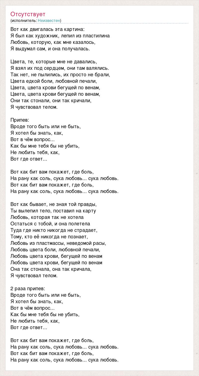 Вот как двигалась эта картина: Я был как художник, лепил из пластилина Любовь, которую, как мне казалось, Я выдумал сам, и она получалась. Цвета, те, которые мне не давались, Я взял их под сердцем, они там валялись. Так нет, не пылились, их просто не брали, Цвета едкой боли, любовной печали, Цвета, цвета крови бегущей по венам, Цвета, цвета крови бегущей по венам, Они так стонали, они так кричали, Я чувствовал телом. Припев: Вроде того быть или не быть, Я хотел бы знать, как, Вот в чём вопрос... Как бы мне тебя бы не убить, Не любить тебя, как, Вот где ответ... Вот как бит вам покажет, где боль, На рану как соль, сука любовь... сука любовь. Вот как бит вам покажет, где боль, На рану как соль, сука любовь... сука любовь. Вот как бывает, не зная той правды, Ты вылепил тело, поставил на карту Любовь, которая так не хотела Остаться с тобой, и она полетела Туда где никто никогда не страдает, Тому, кто её никогда не познает, Любовь из пластмассы, неведомой расы, Любовь цвета боли, любовной печали, Любовь цвета крови, бегущей по венам Любовь цвета крови, бегущей по венам Она так стонала, она так кричала, Я чувствовал телом. 2 раза припев: Вроде того быть или не быть, Я хотел бы знать, как, Вот в чём вопрос... Как бы мне тебя бы не убить, Не любить тебя, как, Вот где ответ... Вот как бит вам покажет, где боль, На рану как соль, сука любовь... сука любовь. Вот как бит вам покажет, где боль, На рану как соль, сука любовь... сука любовь.