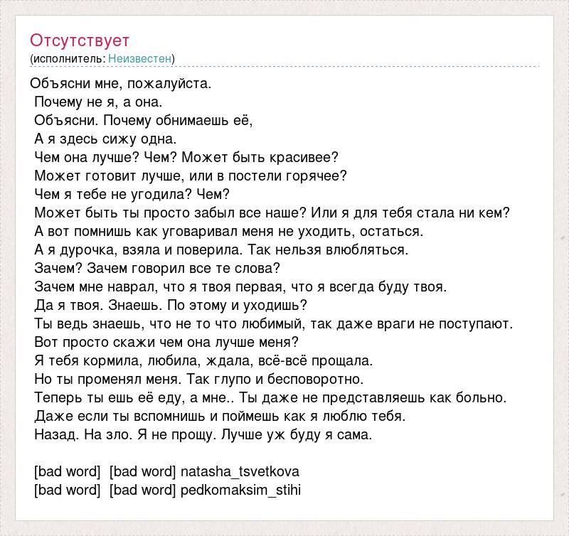 Объясни мне, пожалуйста. Почему не я, а она. Объясни. Почему обнимаешь её, А я здесь сижу одна. Чем она лучше? Чем? Может быть красивее? Может готовит лучше, или в постели горячее? Чем я тебе не угодила? Чем? Может быть ты просто забыл все наше? Или я для тебя стала ни кем? А вот помнишь как уговаривал меня не уходить, остаться. А я дурочка, взяла и поверила. Так нельзя влюбляться. Зачем? Зачем говорил все те слова? Зачем мне наврал, что я твоя первая, что я всегда буду твоя. Да я твоя. Знаешь. По этому и уходишь? Ты ведь знаешь, что не то что любимый, так даже враги не поступают. Вот просто скажи чем она лучше меня? Я тебя кормила, любила, ждала, всё-всё прощала. Но ты променял меня. Так глупо и бесповоротно. Теперь ты ешь её еду, а мне.. Ты даже не представляешь как больно. Даже если ты вспомнишь и поймешь как я люблю тебя. Назад. На зло. Я не прощу. Лучше уж буду я сама. [bad word] [bad word] natasha_tsvetkova [bad word] [bad word] pedkomaksim_stihi