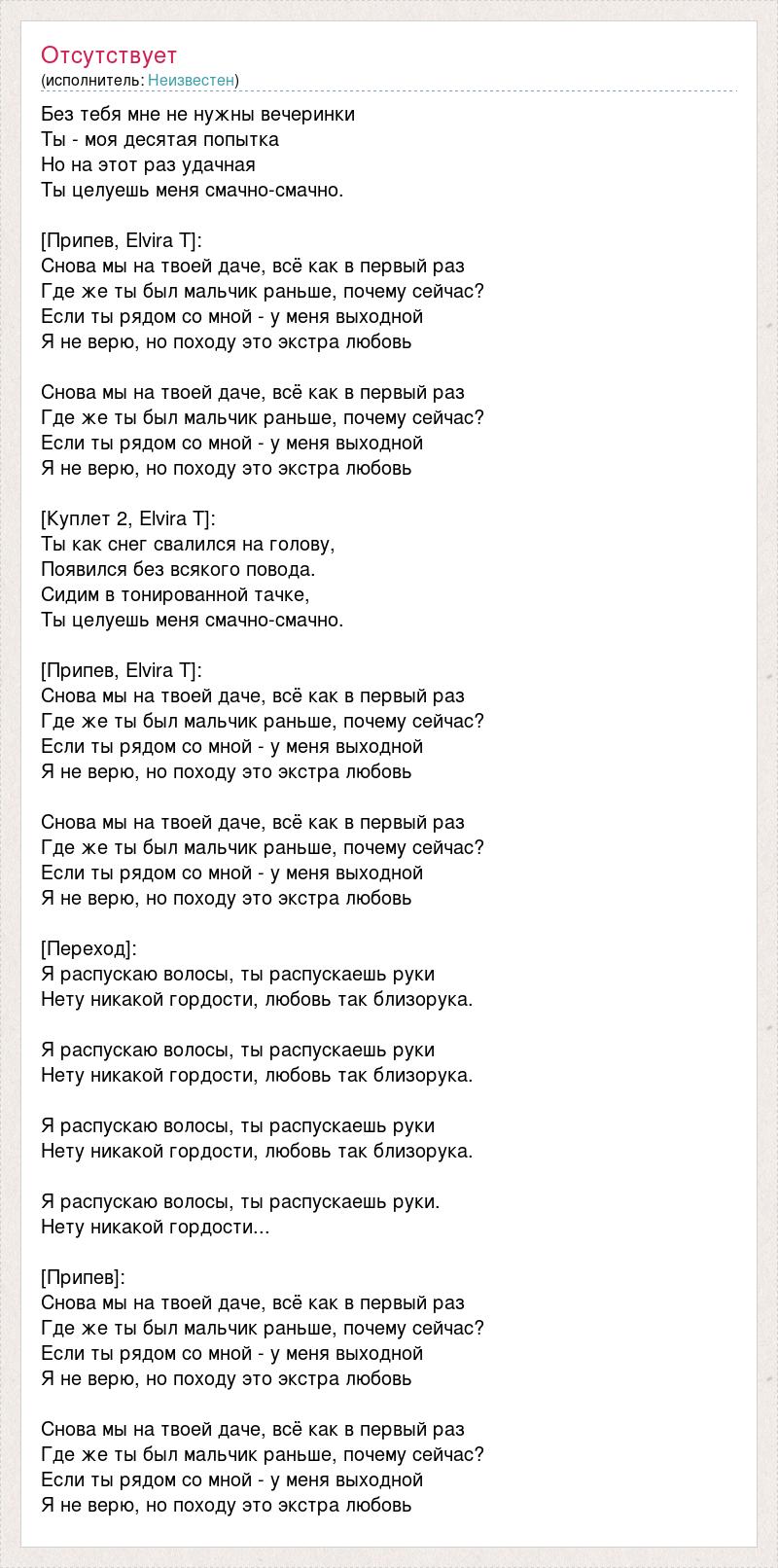 Без тебя мне не нужны вечеринки Ты - моя десятая попытка Но на этот раз удачная Ты целуешь меня смачно-смачно. [Припев, Elvira T]: Снова мы на твоей даче, всё как в первый раз Где же ты был мальчик раньше, почему сейчас? Если ты рядом со мной - у меня выходной Я не верю, но походу это экстра любовь Снова мы на твоей даче, всё как в первый раз Где же ты был мальчик раньше, почему сейчас? Если ты рядом со мной - у меня выходной Я не верю, но походу это экстра любовь [Куплет 2, Elvira T]: Ты как снег свалился на голову, Появился без всякого повода. Сидим в тонированной тачке, Ты целуешь меня смачно-смачно. [Припев, Elvira T]: Снова мы на твоей даче, всё как в первый раз Где же ты был мальчик раньше, почему сейчас? Если ты рядом со мной - у меня выходной Я не верю, но походу это экстра любовь Снова мы на твоей даче, всё как в первый раз Где же ты был мальчик раньше, почему сейчас? Если ты рядом со мной - у меня выходной Я не верю, но походу это экстра любовь [Переход]: Я распускаю волосы, ты распускаешь руки Нету никакой гордости, любовь так близорука. Я распускаю волосы, ты распускаешь руки Нету никакой гордости, любовь так близорука. Я распускаю волосы, ты распускаешь руки Нету никакой гордости, любовь так близорука. Я распускаю волосы, ты распускаешь руки. Нету никакой гордости... [Припев]: Снова мы на твоей даче, всё как в первый раз Где же ты был мальчик раньше, почему сейчас? Если ты рядом со мной - у меня выходной Я не верю, но походу это экстра любовь Снова мы на твоей даче, всё как в первый раз Где же ты был мальчик раньше, почему сейчас? Если ты рядом со мной - у меня выходной Я не верю, но походу это экстра любовь