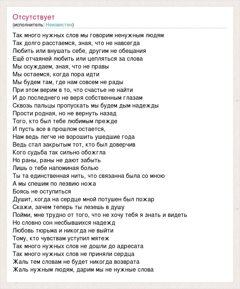 Так много нужных слов мы говорим ненужным людям Так долго расстаемся, зная, что не навсегда Любить или внушать себе, другим не обещания Ещё отчаяней любить или цепляться за слова Мы осуждаем, зная, что не правы Мы остаемся, когда пора идти Мы будем там, где нам совсем не рады При этом верим в то, что счастье не найти И до последнего не веря собственным глазам Сквозь пальцы пропускать мы будем дым надежды Прости родная, но не вернуть назад Того, кто был тебе любимым прежде И пусть все в прошлом остается, Нам ведь легче не ворошить ушедшие года Ведь стал закрытым тот, кто был доверчив Кого судьба так сильно обожгла Но раны, раны не дают забыть Лишь о тебе напоминая болью Ты та единственная нить, что связанна была со мною А мы спешим по лезвию ножа Боясь не оступиться Душит, когда на сердце мной потушен был пожар Скажи, зачем теперь ты лезешь в душу Пойми, мне трудно от того, что не хочу тебя я знать и видеть Но словно сон несбывшихся надежд Любовь тюрьма и никогда не выйти Тому, кто чувствам уступил мятеж Так много нужных слов не дошли до адресата Так много нужных слов не приняли сердца Жаль тем словам не будет никогда возврата Жаль нужным людям, дарим мы не нужные слова