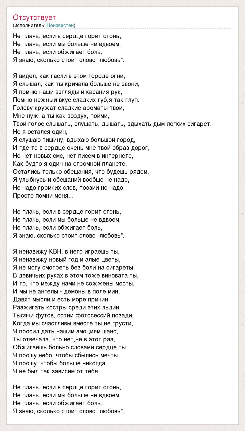 Не плачь, если в сердце горит огонь, Не плачь, если мы больше не вдвоем, Не плачь, если обжигает боль, Я знаю, сколько стоит слово "любовь". Я видел, как гасли в этом городе огни, Я слышал, как ты кричала больше не звони, Я помню наши взгляды и касания рук, Помню нежный вкус сладких губ,я так глуп. Голову кружат сладкие ароматы твои, Мне нужна ты как воздух, пойми, Твой голос слышать, слушать, дышать, вдыхать дым легких сигарет, Но я остался один, Я слушаю тишину, вдыхаю большой город, И где-то в сердце очень мне твой образ дорог, Но нет новых смс, нет писем в интернете, Как-будто я один на огромной планете, Остались только обещания, что будешь рядом, Я улыбнусь и обещаний вообще не надо, Не надо громких слов, поэзии не надо, Просто помни меня... Не плачь, если в сердце горит огонь, Не плачь, если мы больше не вдвоем, Не плачь, если обжигает боль, Я знаю, сколько стоит слово "любовь". Я ненавижу КВН, в него играешь ты, Я ненавижу новый год и алые цветы, Я не могу смотреть без боли на сигареты В девичьих руках в этом тоже виновата ты, И то, что между нами не сожжены мосты, И мы не ангелы - демоны в поле мин, Давят мысли и есть море причин Разжигать костры среди этих льдин, Тысячи футов, сотни фотосессий позади, Когда мы счастливы вместе ты не грусти, Я просил дать нашим эмоциям шанс, Ты отвечала, что нет,не в этот раз, Обжигаешь больно словами сердце ты, Я прошу небо, чтобы сбылись мечты, Я прошу, чтобы больше никогда Я не был так зависим от тебя... Не плачь, если в сердце горит огонь, Не плачь, если мы больше не вдвоем, Не плачь, если обжигает боль, Я знаю, сколько стоит слово "любовь".