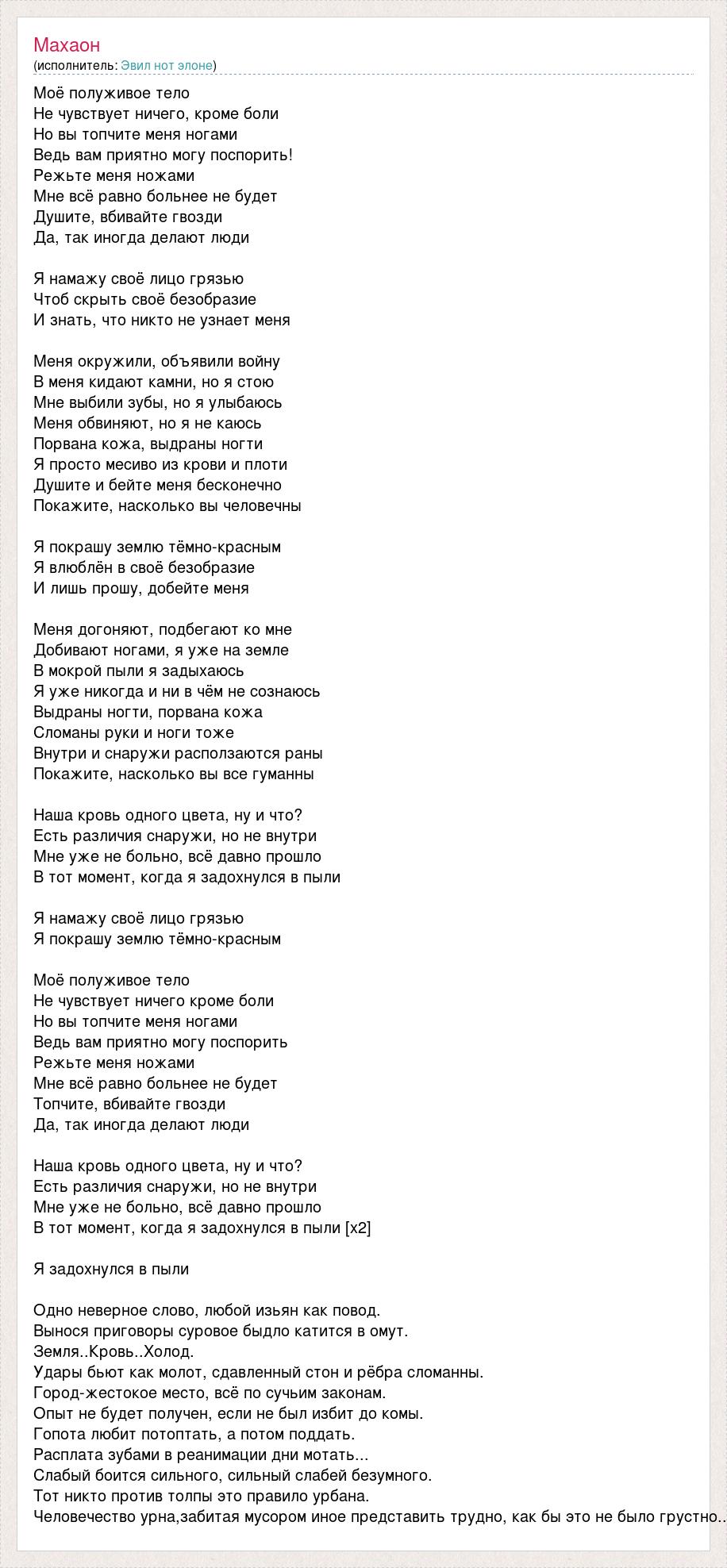 Моё полуживое тело Не чувствует ничего, кроме боли Но вы топчите меня ногами Ведь вам приятно могу поспорить! Режьте меня ножами Мне всё равно больнее не будет Душите, вбивайте гвозди Да, так иногда делают люди Я намажу своё лицо грязью Чтоб скрыть своё безобразие И знать, что никто не узнает меня Меня окружили, объявили войну В меня кидают камни, но я стою Мне выбили зубы, но я улыбаюсь Меня обвиняют, но я не каюсь Порвана кожа, выдраны ногти Я просто месиво из крови и плоти Душите и бейте меня бесконечно Покажите, насколько вы человечны Я покрашу землю тёмно-красным Я влюблён в своё безобразие И лишь прошу, добейте меня Меня догоняют, подбегают ко мне Добивают ногами, я уже на земле В мокрой пыли я задыхаюсь Я уже никогда и ни в чём не сознаюсь Выдраны ногти, порвана кожа Сломаны руки и ноги тоже Внутри и снаружи расползаются раны Покажите, насколько вы все гуманны Наша кровь одного цвета, ну и что? Есть различия снаружи, но не внутри Мне уже не больно, всё давно прошло В тот момент, когда я задохнулся в пыли Я намажу своё лицо грязью Я покрашу землю тёмно-красным Моё полуживое тело Не чувствует ничего кроме боли Но вы топчите меня ногами Ведь вам приятно могу поспорить Режьте меня ножами Мне всё равно больнее не будет Топчите, вбивайте гвозди Да, так иногда делают люди Наша кровь одного цвета, ну и что? Есть различия снаружи, но не внутри Мне уже не больно, всё давно прошло В тот момент, когда я задохнулся в пыли [x2] Я задохнулся в пыли Одно неверное слово, любой изьян как повод. Вынося приговоры суровое быдло катится в омут. Земля..Кровь..Холод. Удары бьют как молот, сдавленный стон и рёбра сломанны. Город-жестокое место, всё по сучьим законам. Опыт не будет получен, если не был избит до комы. Гопота любит потоптать, а потом поддать. Расплата зубами в реанимации дни мотать... Слабый боится сильного, сильный слабей безумного. Тот никто против толпы это правило урбана. Человечество урна,забитая мусором иное представить трудно, как бы это не было грустно..