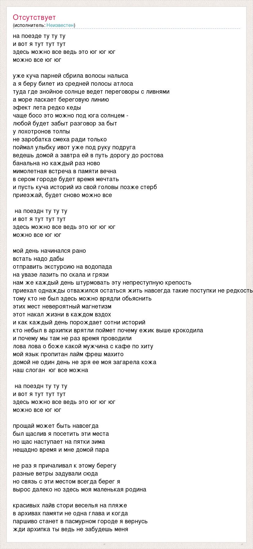 на поезде ту ту ту и вот я тут тут тут здесь можно все ведь это юг юг юг можно все юг юг уже куча парней сбрила волосы налыса а я беру билет из средней полосы атлоса туда где знойное солнце ведет переговоры с ливнями а море ласкает береговую линию эфект лета редко кеды чаще босо это можно под юга солнцем - любой будет забыт разговор за быт у лохотронов толпы не заробатка смеха ради только поймал улыбку ивот уже под руку подруга ведешь домой а завтра ей в путь дорогу до ростова банальна но каждый раз ново мимолетная встреча в памяти вечна в сером городе будет время мечтать и пусть куча историй из свой головы позже стерб приезжай, будет сново можно все на поездн ту ту ту и вот я тут тут тут здесь можно все ведь это юг юг юг можно все юг юг мой день начинался рано встать надо дабы отправить экстурсию на водопада на увазе лазить по скала и грязи нам же каждый день штурмовать эту непреступную крепость приехал однажды отважился остаться жить навсегда такие поступки не редкость тому кто не был здесь можно врядли обьяснить этих мест невероятный магнетизм этот накал жизни в каждом вздох и как каждый день порождает сотни историй кто небыл в архипки врятли поймет почему ежик выше крокодила и почему мы там не раз время проводили лова лова о боже какой мужчина с кафе по хиту мой язык пропитан лайм фреш махито домой не один день не зря ее моя загарела кожа наш слоган юг все можна на поездн ту ту ту и вот я тут тут тут здесь можно все ведь это юг юг юг можно все юг юг прощай может быть навсегда был щаслив я посетить эти места но щас наступает на пятки зима нещадно время и мне домой пара не раз я причаливал к этому берегу разные ветры задували сюда но связь с эти местом всегда берег я вырос далеко но здесь моя маленькая родина красивых лайв стори веселья на пляже в архивах памяти не одна глава и когда паршиво станет в пасмурном городе я вернусь жди архипка ты ведь не забудешь меня
