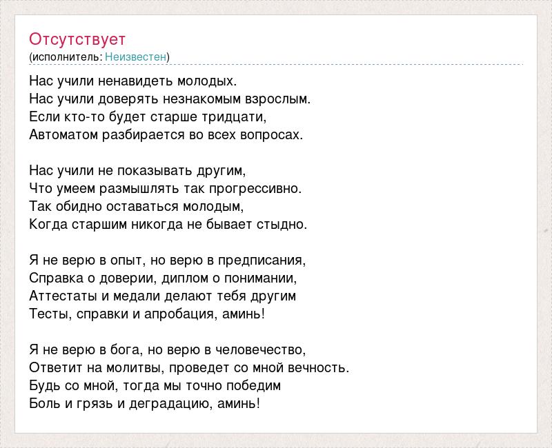 Нас учили ненавидеть молодых. Нас учили доверять незнакомым взрослым. Если кто-то будет старше тридцати, Автоматом разбирается во всех вопросах. Нас учили не показывать другим, Что умеем размышлять так прогрессивно. Так обидно оставаться молодым, Когда старшим никогда не бывает стыдно. Я не верю в опыт, но верю в предписания, Справка о доверии, диплом о понимании, Аттестаты и медали делают тебя другим Тесты, справки и апробация, аминь! Я не верю в бога, но верю в человечество, Ответит на молитвы, проведет со мной вечность. Будь со мной, тогда мы точно победим Боль и грязь и деградацию, аминь!