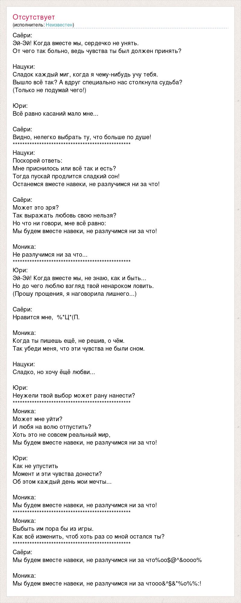 Саёри: Эй-Эй! Когда вместе мы, сердечко не унять. От чего так больно, ведь чувства ты был должен принять? Нацуки: Сладок каждый миг, когда я чему-нибудь учу тебя. Вышло всё так? А вдруг специально нас столкнула судьба? (Только не подумай чего!) Юри: Всё равно касаний мало мне... Саёри: Видно, нелегко выбрать ту, что больше по душе! ************************************************* Нацуки: Поскорей ответь: Мне приснилось или всё так и есть? Тогда пускай продлится сладкий сон! Останемся вместе навеки, не разлучимся ни за что! Саёри: Может это зря? Так выражать любовь свою нельзя? Но что ни говори, мне всё равно: Мы будем вместе навеки, не разлучимся ни за что! Моника: Не разлучимся ни за что... ************************************************* Юри: Эй-Эй! Когда вместе мы, не знаю, как и быть... Но до чего люблю взгляд твой ненароком ловить. (Прошу прощения, я наговорила лишнего...) Саёри: Нравится мне, %*Ц*(П. Моника: Когда ты пишешь ещё, не решив, о чём. Так убеди меня, что эти чувства не были сном. Нацуки: Сладко, но хочу ёщё любви... Юри: Неужели твой выбор может рану нанести? ************************************************* Моника: Может мне уйти? И любя на волю отпустить? Хоть это не совсем реальный мир, Мы будем вместе навеки, не разлучимся ни за что! Юри: Как не упустить Момент и эти чувства донести? Об этом каждый день мои мечты... Моника: Мы будем вместе навеки, не разлучимся ни за что! ************************************************* Моника: Выбыть им пора бы из игры. Как всё изменить, чтоб хоть раз со мной остался ты? ************************************************* Саёри: Мы будем вместе навеки, не разлучимся ни за что%оо$@^&оооо% Моника: Мы будем вместе навеки, не разлучимся ни за чтооо&^$&*%о%%:!