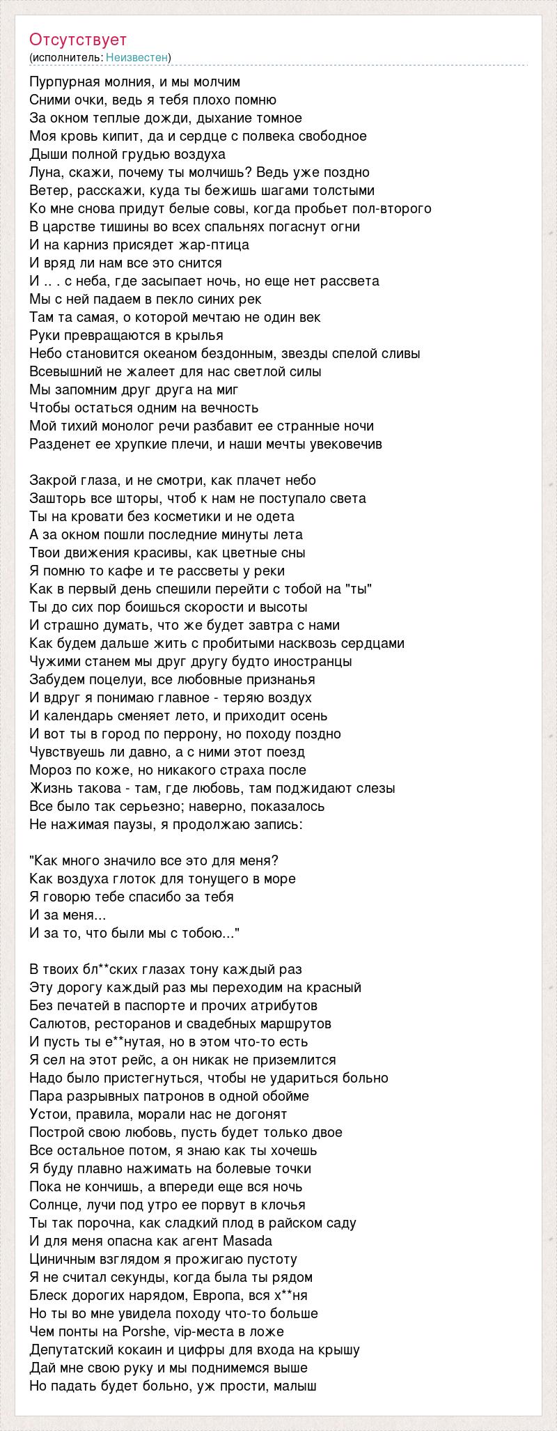 Пурпурная молния, и мы молчим Сними очки, ведь я тебя плохо помню За окном теплые дожди, дыхание томное Моя кровь кипит, да и сердце с полвека свободное Дыши полной грудью воздуха Луна, скажи, почему ты молчишь? Ведь уже поздно Ветер, расскажи, куда ты бежишь шагами толстыми Ко мне снова придут белые совы, когда пробьет пол-второго В царстве тишины во всех спальнях погаснут огни И на карниз присядет жар-птица И вряд ли нам все это снится И .. . с неба, где засыпает ночь, но еще нет рассвета Мы с ней падаем в пекло синих рек Там та самая, о которой мечтаю не один век Руки превращаются в крылья Небо становится океаном бездонным, звезды спелой сливы Всевышний не жалеет для нас светлой силы Мы запомним друг друга на миг Чтобы остаться одним на вечность Мой тихий монолог речи разбавит ее странные ночи Разденет ее хрупкие плечи, и наши мечты увековечив Закрой глаза, и не смотри, как плачет небо Зашторь все шторы, чтоб к нам не поступало света Ты на кровати без косметики и не одета А за окном пошли последние минуты лета Твои движения красивы, как цветные сны Я помню то кафе и те рассветы у реки Как в первый день спешили перейти с тобой на "ты" Ты до сих пор боишься скорости и высоты И страшно думать, что же будет завтра с нами Как будем дальше жить с пробитыми насквозь сердцами Чужими станем мы друг другу будто иностранцы Забудем поцелуи, все любовные признанья И вдруг я понимаю главное - теряю воздух И календарь сменяет лето, и приходит осень И вот ты в город по перрону, но походу поздно Чувствуешь ли давно, а с ними этот поезд Мороз по коже, но никакого страха после Жизнь такова - там, где любовь, там поджидают слезы Все было так серьезно; наверно, показалось Не нажимая паузы, я продолжаю запись: "Как много значило все это для меня? Как воздуха глоток для тонущего в море Я говорю тебе спасибо за тебя И за меня... И за то, что были мы с тобою..." В твоих бл**ских глазах тону каждый раз Эту дорогу каждый раз мы переходим на красный Без печатей в паспорте и прочих атрибутов Салютов, ресторанов и свадебных маршрутов И пусть ты е**нутая, но в этом что-то есть Я сел на этот рейс, а он никак не приземлится Надо было пристегнуться, чтобы не удариться больно Пара разрывных патронов в одной обойме Устои, правила, морали нас не догонят Построй свою любовь, пусть будет только двое Все остальное потом, я знаю как ты хочешь Я буду плавно нажимать на болевые точки Пока не кончишь, а впереди еще вся ночь Солнце, лучи под утро ее порвут в клочья Ты так порочна, как сладкий плод в райском саду И для меня опасна как агент Masada Циничным взглядом я прожигаю пустоту Я не считал секунды, когда была ты рядом Блеск дорогих нарядом, Европа, вся х**ня Но ты во мне увидела походу что-то больше Чем понты на Porshe, vip-места в ложе Депутатский кокаин и цифры для входа на крышу Дай мне свою руку и мы поднимемся выше Но падать будет больно, уж прости, малыш