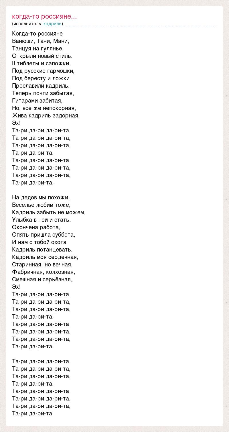 Когда-то россияне Ванюши, Тани, Мани, Танцуя на гулянье, Открыли новый стиль. Штиблеты и сапожки. Под русские гармошки, Под бересту и ложки Прославили кадриль. Теперь почти забытая, Гитарами забитая, Но, всё же непокорная, Жива кадриль задорная. Эх! Та-ри да-ри да-ри-та Та-ри да-ри да-ри-та, Та-ри да-ри да-ри-та, Та-ри да-ри-та. Та-ри да-ри да-ри-та Та-ри да-ри да-ри-та, Та-ри да-ри да-ри-та, Та-ри да-ри-та. На дедов мы похожи, Веселье любим тоже, Кадриль забыть не можем, Улыбка в ней и стать. Окончена работа, Опять пришла суббота, И нам с тобой охота Кадриль потанцевать. Кадриль моя сердечная, Старинная, но вечная, Фабричная, колхозная, Смешная и серьёзная, Эх! Та-ри да-ри да-ри-та Та-ри да-ри да-ри-та, Та-ри да-ри да-ри-та, Та-ри да-ри-та. Та-ри да-ри да-ри-та Та-ри да-ри да-ри-та, Та-ри да-ри да-ри-та, Та-ри да-ри-та. Та-ри да-ри да-ри-та Та-ри да-ри да-ри-та, Та-ри да-ри да-ри-та, Та-ри да-ри-та. Та-ри да-ри да-ри-та Та-ри да-ри да-ри-та, Та-ри да-ри да-ри-та, Та-ри да-ри-та