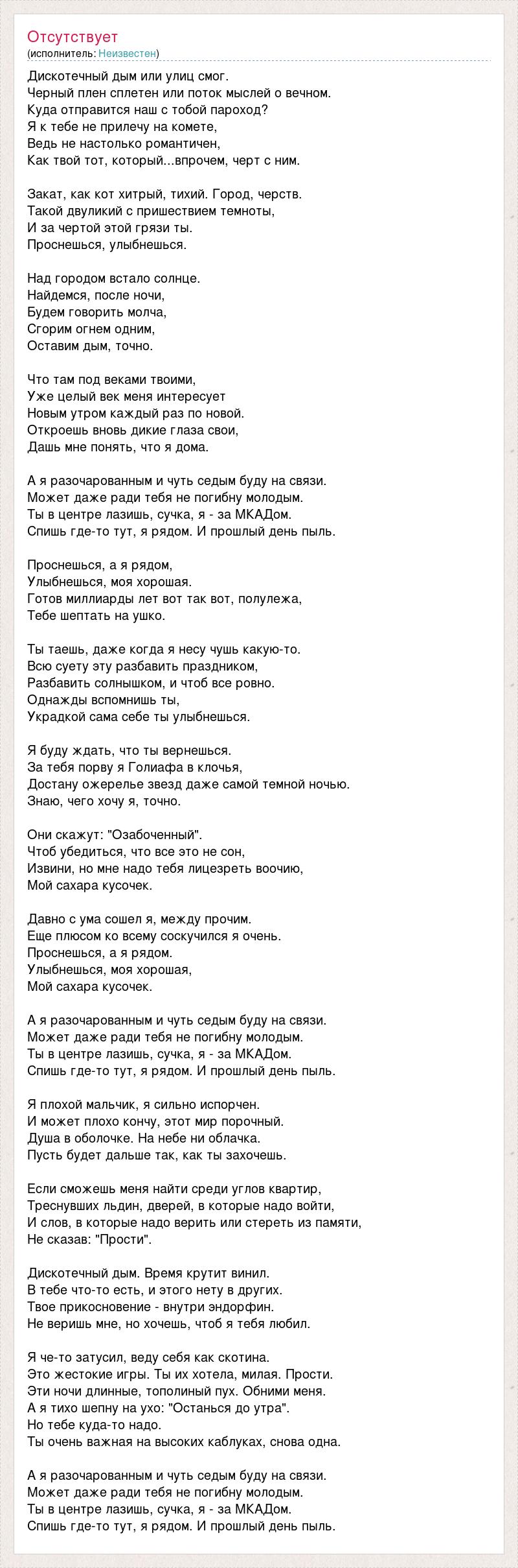 Дискотечный дым или улиц смог. Черный плен сплетен или поток мыслей о вечном. Куда отправится наш с тобой пароход? Я к тебе не прилечу на комете, Ведь не настолько романтичен, Как твой тот, который...впрочем, черт с ним. Закат, как кот хитрый, тихий. Город, черств. Такой двуликий с пришествием темноты, И за чертой этой грязи ты. Проснешься, улыбнешься. Над городом встало солнце. Найдемся, после ночи, Будем говорить молча, Сгорим огнем одним, Оставим дым, точно. Что там под веками твоими, Уже целый век меня интересует Новым утром каждый раз по новой. Откроешь вновь дикие глаза свои, Дашь мне понять, что я дома. А я разочарованным и чуть седым буду на связи. Может даже ради тебя не погибну молодым. Ты в центре лазишь, сучка, я - за МКАДом. Спишь где-то тут, я рядом. И прошлый день пыль. Проснешься, а я рядом, Улыбнешься, моя хорошая. Готов миллиарды лет вот так вот, полулежа, Тебе шептать на ушко. Ты таешь, даже когда я несу чушь какую-то. Всю суету эту разбавить праздником, Разбавить солнышком, и чтоб все ровно. Однажды вспомнишь ты, Украдкой сама себе ты улыбнешься. Я буду ждать, что ты вернешься. За тебя порву я Голиафа в клочья, Достану ожерелье звезд даже самой темной ночью. Знаю, чего хочу я, точно. Они скажут: "Озабоченный". Чтоб убедиться, что все это не сон, Извини, но мне надо тебя лицезреть воочию, Мой сахара кусочек. Давно с ума сошел я, между прочим. Еще плюсом ко всему соскучился я очень. Проснешься, а я рядом. Улыбнешься, моя хорошая, Мой сахара кусочек. А я разочарованным и чуть седым буду на связи. Может даже ради тебя не погибну молодым. Ты в центре лазишь, сучка, я - за МКАДом. Спишь где-то тут, я рядом. И прошлый день пыль. Я плохой мальчик, я сильно испорчен. И может плохо кончу, этот мир порочный. Душа в оболочке. На небе ни облачка. Пусть будет дальше так, как ты захочешь. Если сможешь меня найти среди углов квартир, Треснувших льдин, дверей, в которые надо войти, И слов, в которые надо верить или стереть из памяти, Не сказав: "Прости". Дискотечный дым. Время крутит винил. В тебе что-то есть, и этого нету в других. Твое прикосновение - внутри эндорфин. Не веришь мне, но хочешь, чтоб я тебя любил. Я че-то затусил, веду себя как скотина. Это жестокие игры. Ты их хотела, милая. Прости. Эти ночи длинные, тополиный пух. Обними меня. А я тихо шепну на ухо: "Останься до утра". Но тебе куда-то надо. Ты очень важная на высоких каблуках, снова одна. А я разочарованным и чуть седым буду на связи. Может даже ради тебя не погибну молодым. Ты в центре лазишь, сучка, я - за МКАДом. Спишь где-то тут, я рядом. И прошлый день пыль.